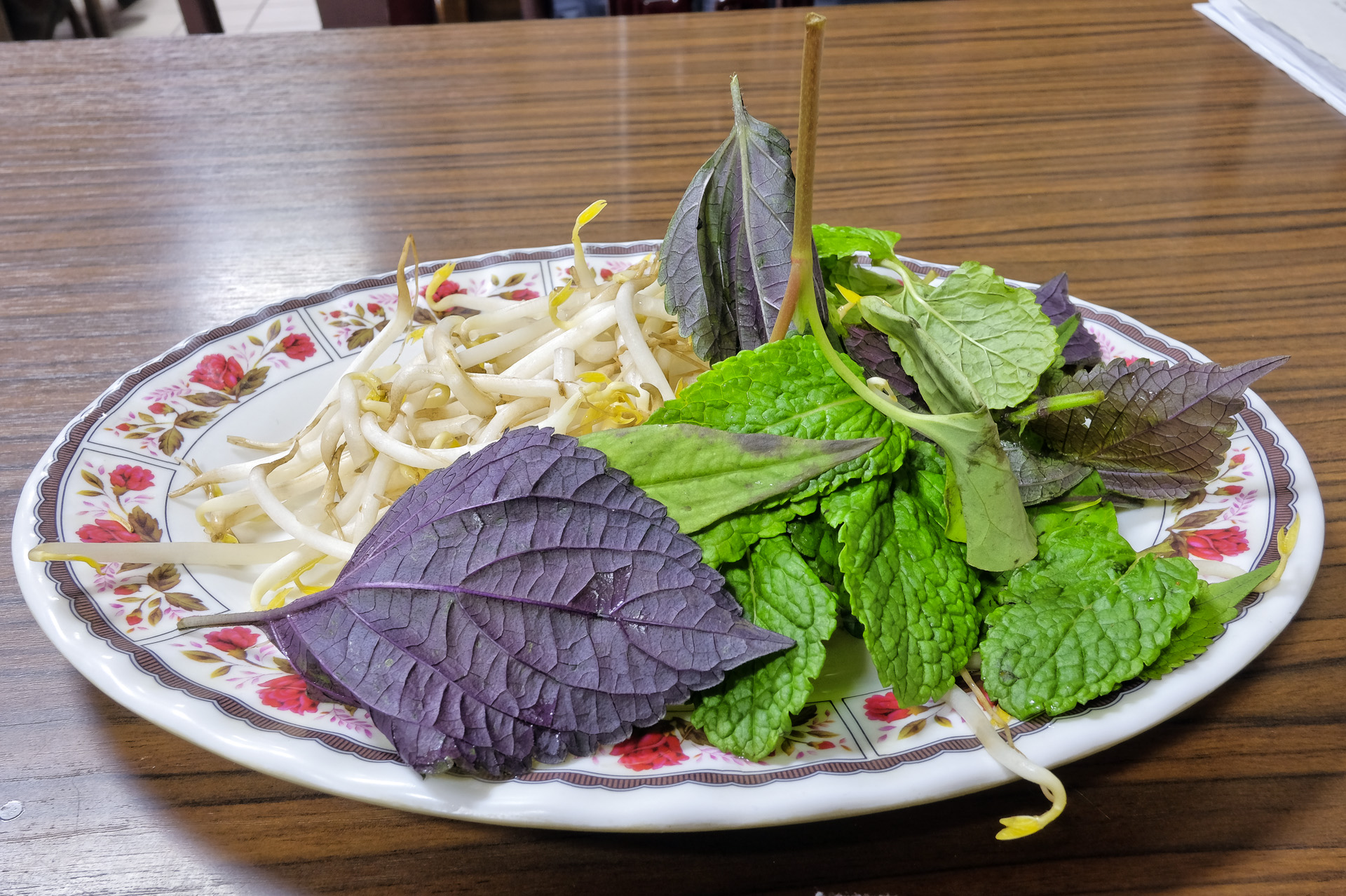 Separat serviert wurden verschiedene Kräuter (Koriander, Minze, Thai-Basilikum ?), Sojasprossen, auf Limette und rote Chilis hatte ich verzichtet.