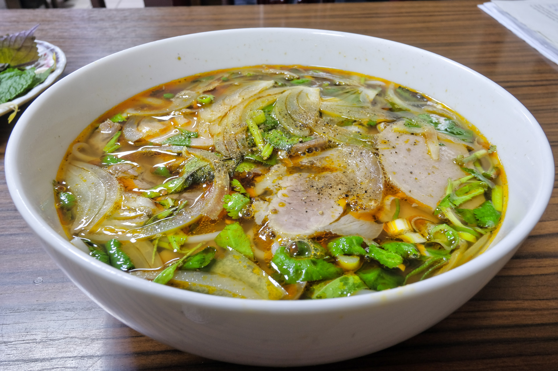 Die Bun Bo Hue enthielt Reisnudeln, Rindfleisch, Fleischwurst (Cha Lua), dünne Eisbeinscheiben, Zwiebeln, Lauchzwiebeln und Zitronengras. Sie war aromatisch und leicht pikant mit dezentem Zitronengrasaroma. Das Fleisch war zart, die dicken runden Nudeln fand ich nicht authentisch. Sehr lecker.