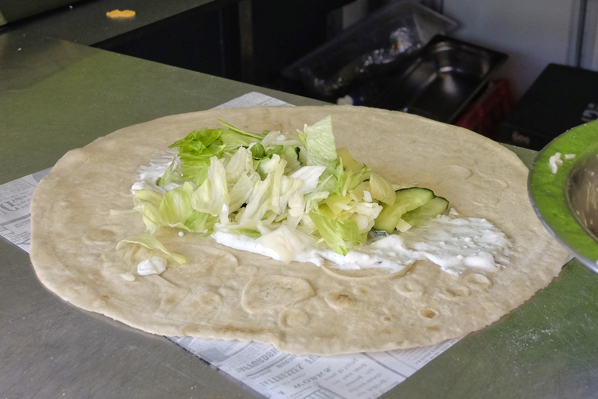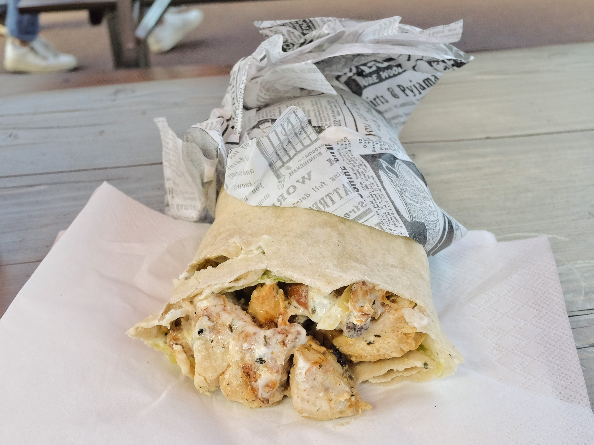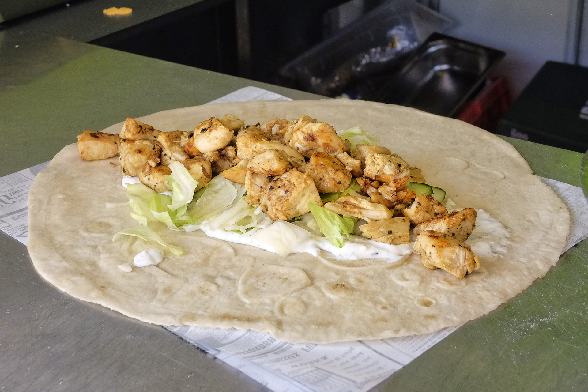 Das Chicken Schawarma Dürüm bestand aus Fladenbrot, einer Joghurt Minz Sauce, Eisbergsalat, Gurken und Hähnchenfleisch. Das Hähnchenfleisch war zart und saftig aber hätte etwas kräftiger gewürzt sein können. Sehr lecker.