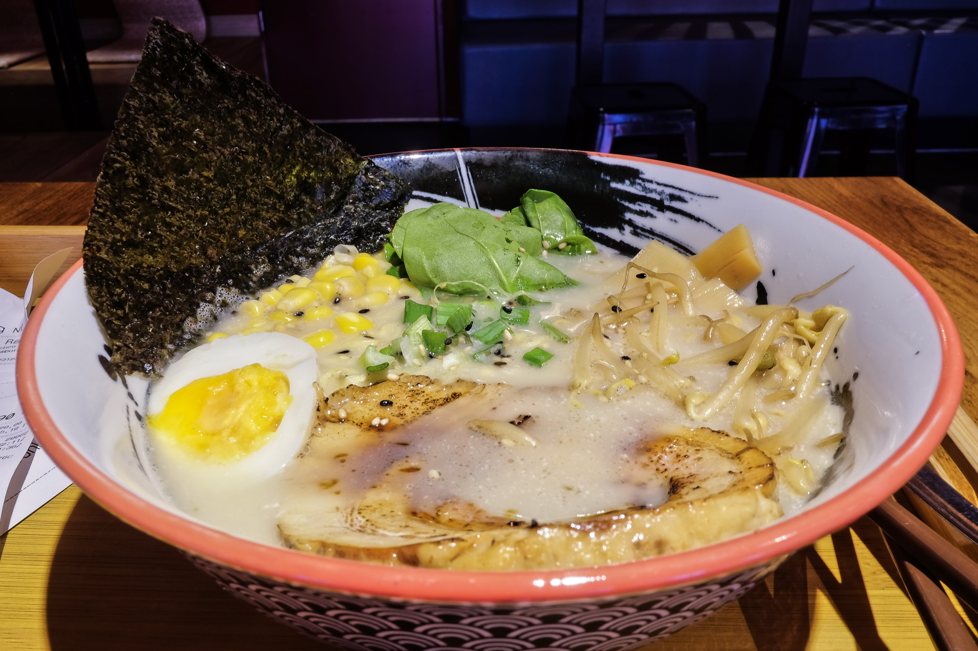 Die Ramen wurde aus einer Schweine Brühe zubereitet. Sie enthielt Nudeln, Mais, Bambus, Sprossen, ein Noriblatt, Chashu (in Scheiben geschnittener gekochter Schweinebauch) und ein halbes gekochtes Ei. Die Brühe hatte keine geschmackliche Tiefe und das Chashu hätte deutlich zarter sein können. Gerade noch sehr lecker, kein Vergleich mit Momo Ramen.