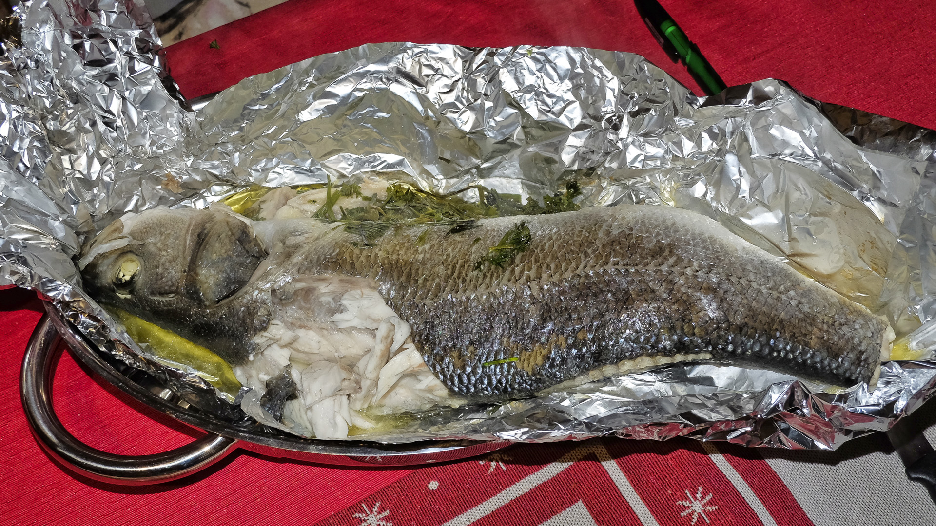Gegart wurde der Wolfsbarsch mit etwas Butter und Kräutern in Alufolie im Backofen (40 min bei 190 °C). Der Wolfsbarsch war zart und saftig und hatte ein feines Aroma, sehr lecker.