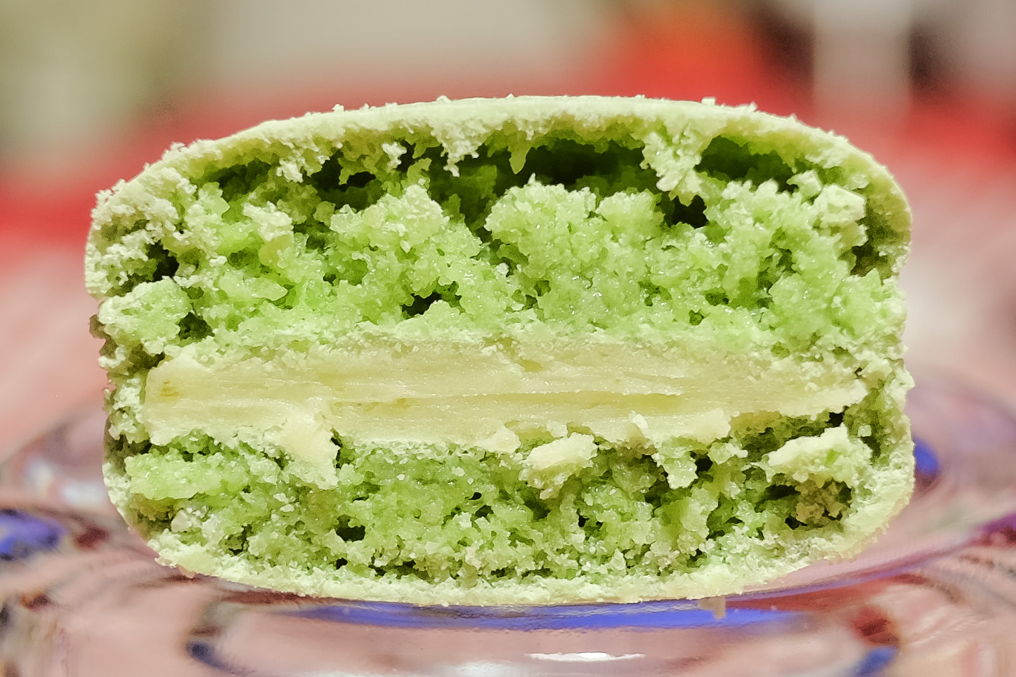 Der Macaron aus einem Mandel Baiser war aussen leicht hart und innen zart und weich mit feiner Mandelnote. Pistazienaroma konnte ich allerdings nicht feststellen. Vielleicht war es auch eine Verwechslung.