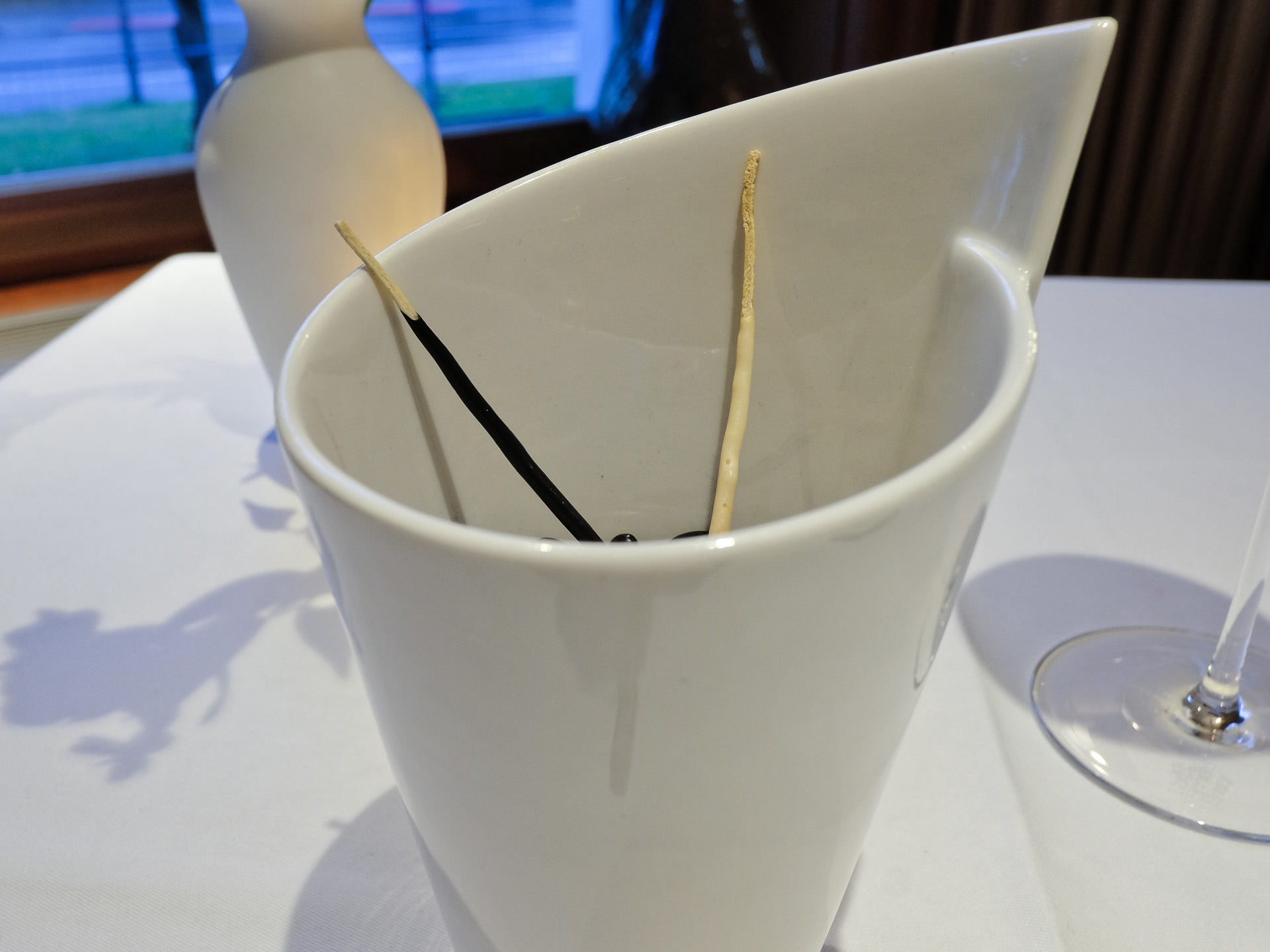 Die Streichholzkartoffeln (Pommes Allumettes) war mit einer dünnen Schicht Creme überzogen, einmal mit Nori Alge (gerade noch sehr lecker) und einmal mit Gruyere (sehr lecker).