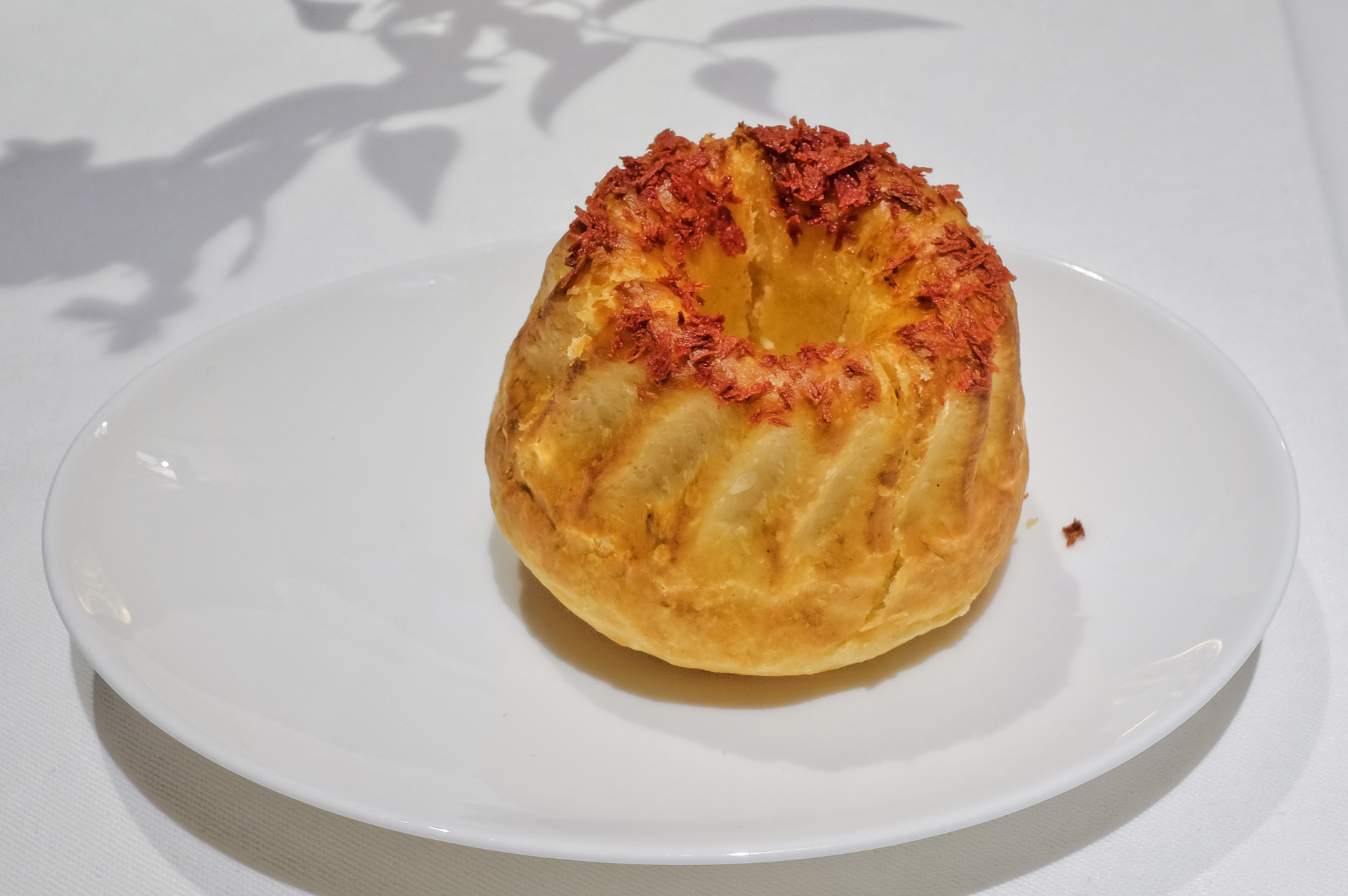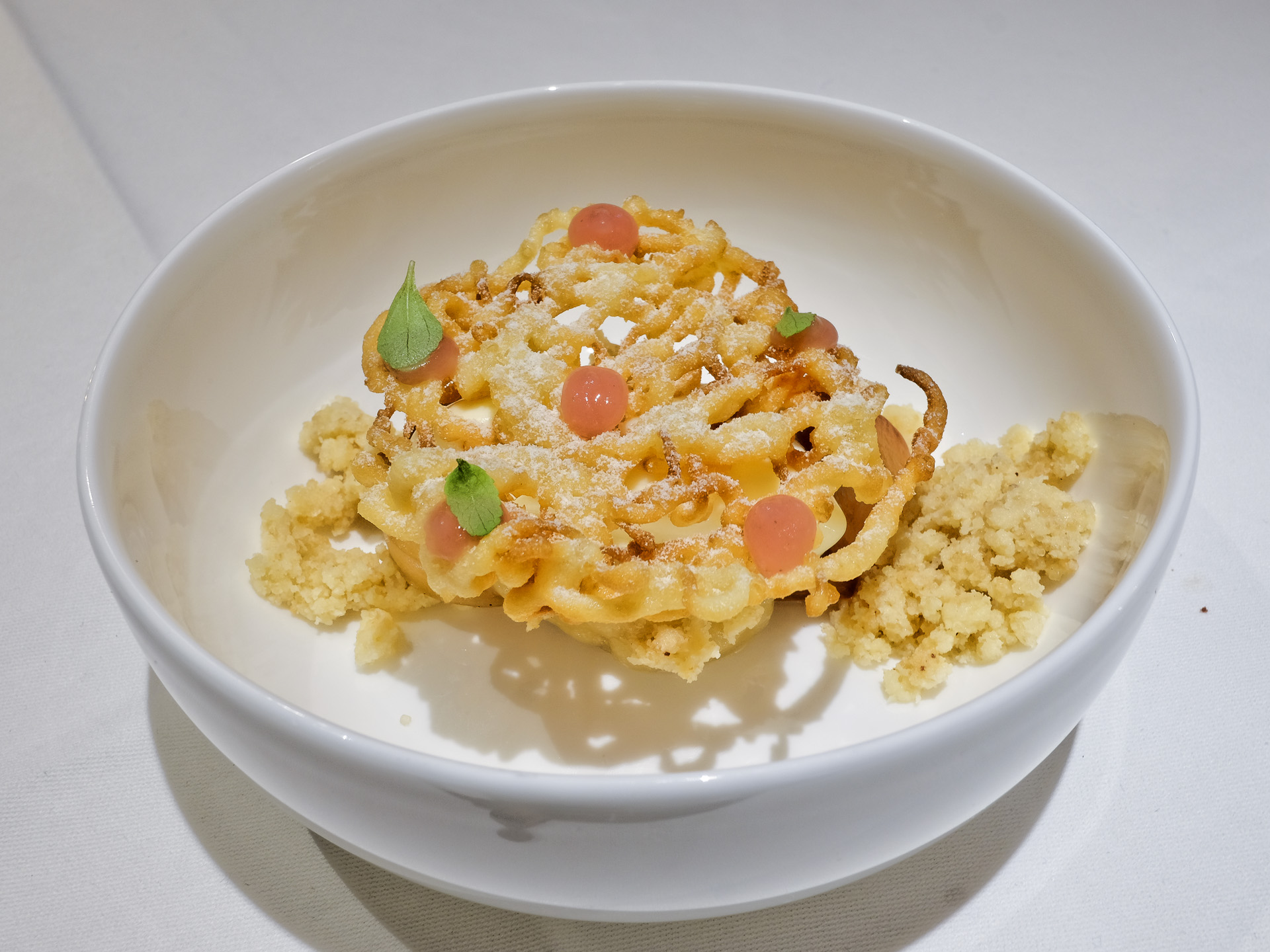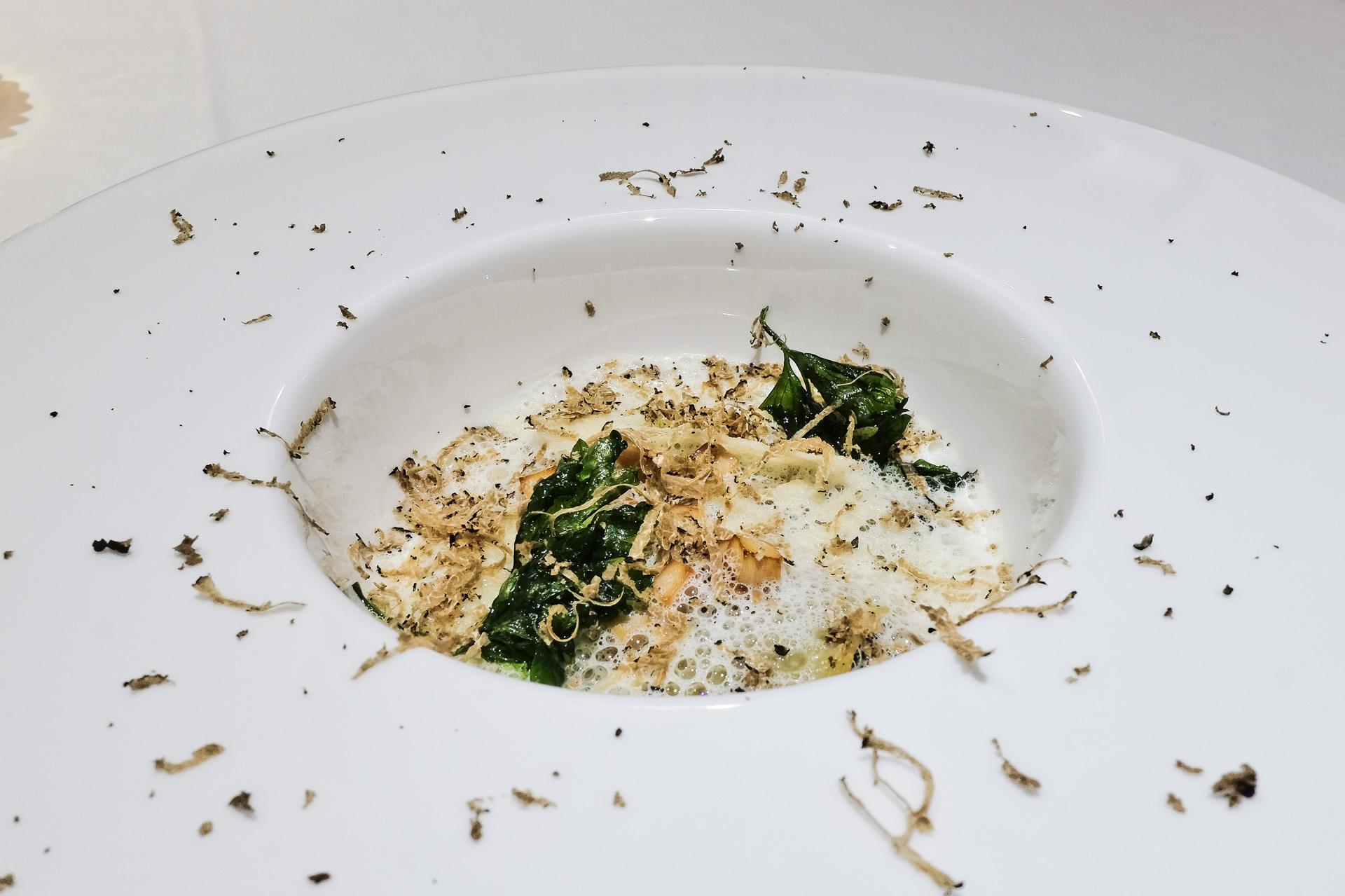 Die Cannelloni waren mit aromatischem Spinat gefüllt. Dazu gab es kleine Steinpilzwürfel, eine aromatische Parmesan Veloute mit feiner Umaminote, Parmesanchips und eher dezente Trüffel. Sehr lecker.