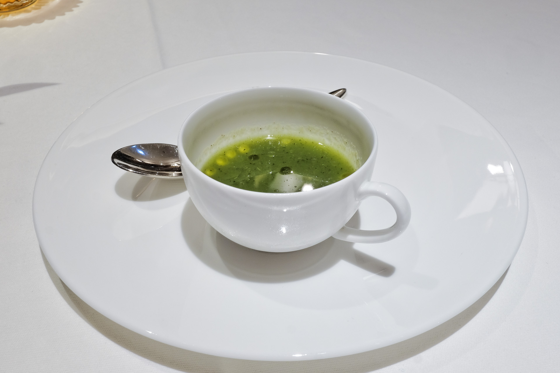 Als Amuse Gueule gab es eine Gurken Kaltschale mit Zitronenmelisse und Olivenöl Kaviar. Frisch mit feinem Aroma, sehr lecker.