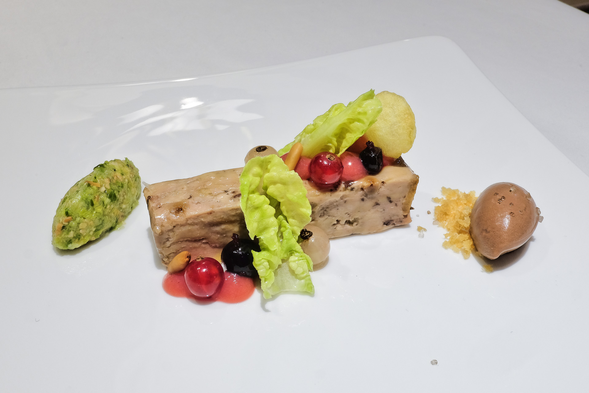 Terrine • Pommes Souffles • Johannisbeere • Kopfsalatherzen • Kuvertüre