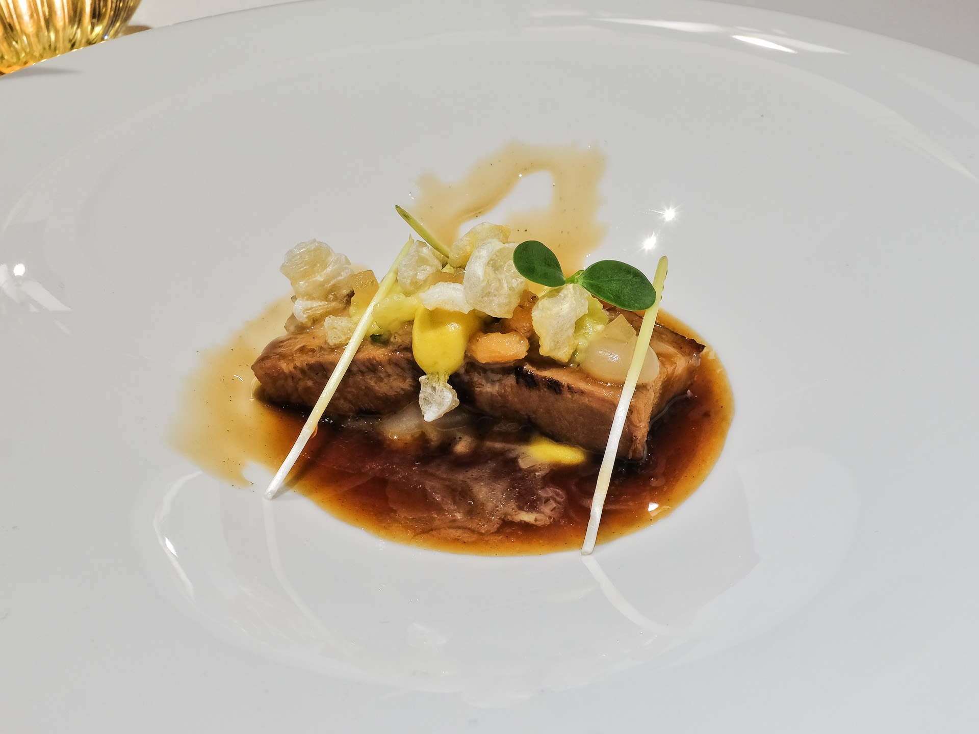 Der Schweinebauch wurde Sous Vide gegart, er war zart, hatte eine feine Textur und ein feines Aroma (Klasse). Dazu gab es Babymais, Nordsee Krabben, gepoppte Schwarte, etwas Birnen Gel und einen mit 5 Spice Gewürzmischung aromatisierten Jus. Der Jus hätte etwas tiefgründiger sein können, die 5 Spice Gewürzmischung wurde auch nur dezent eingesetzt. Sehr lecker.