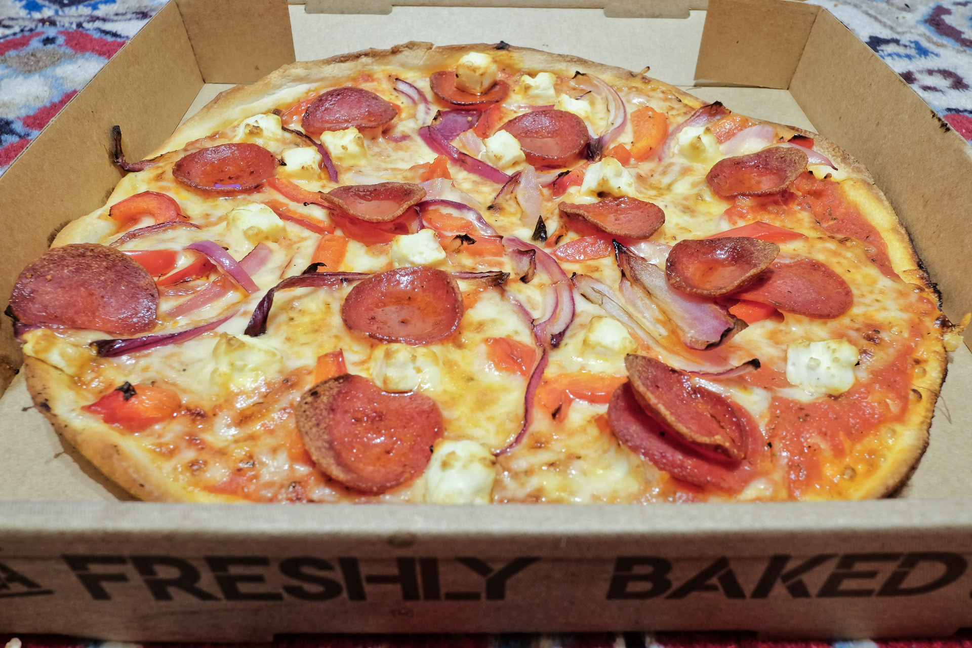 mit Tomatensauce, Käse, Peperoni-Salami, roten Zwiebeln, Paprika und Hirtenkäse