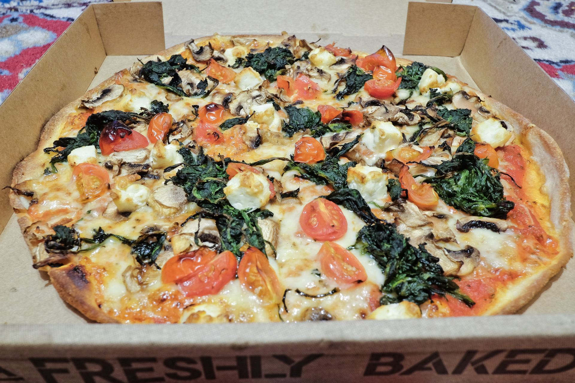 mit Kirschtomaten, Champignons, Spinat und Hirtenkäse
