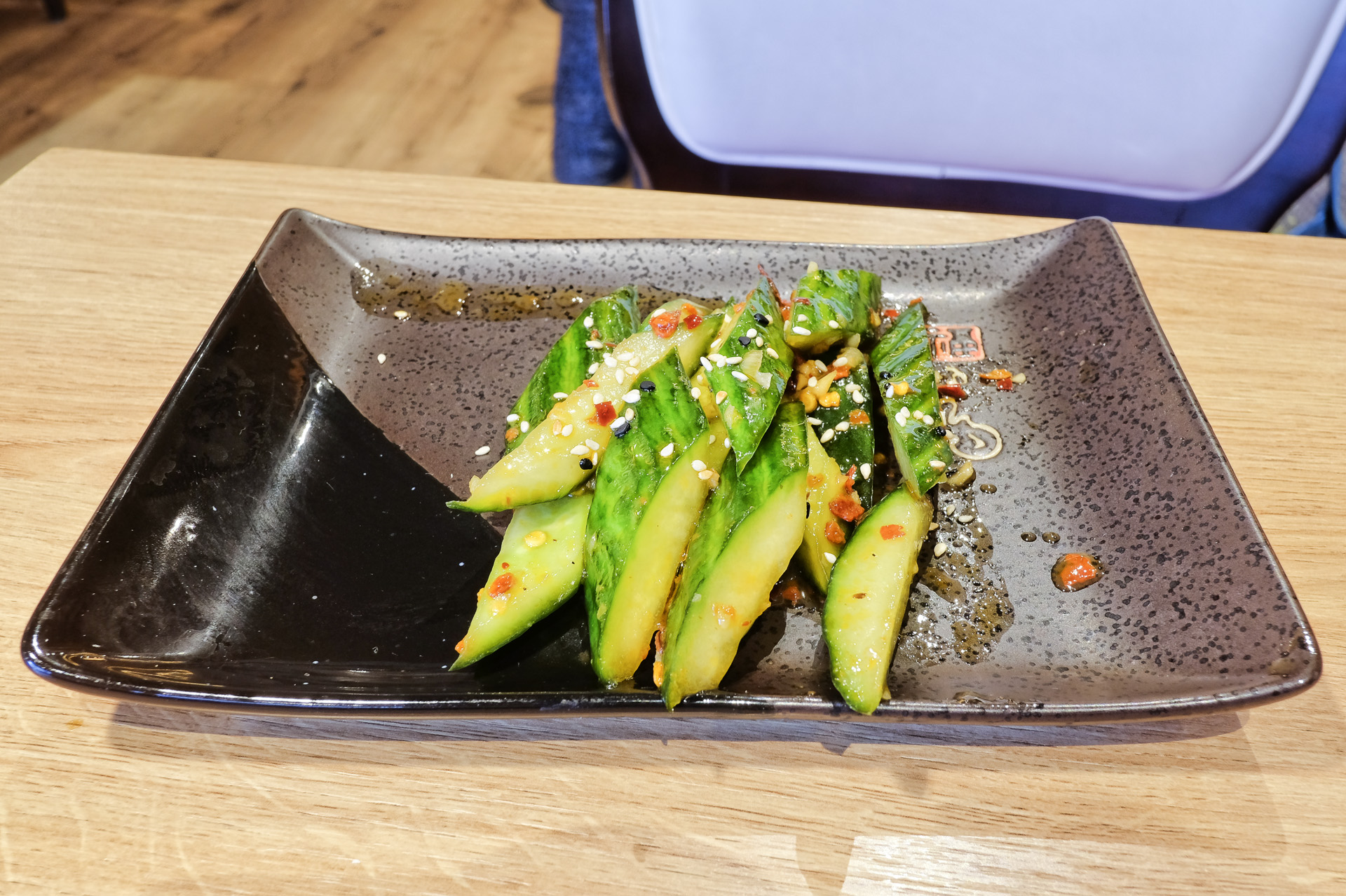 Dazu gab es noch etwas Gurken mit Sojasauce, Chilis und etwas Sesam. Sehr lecker.