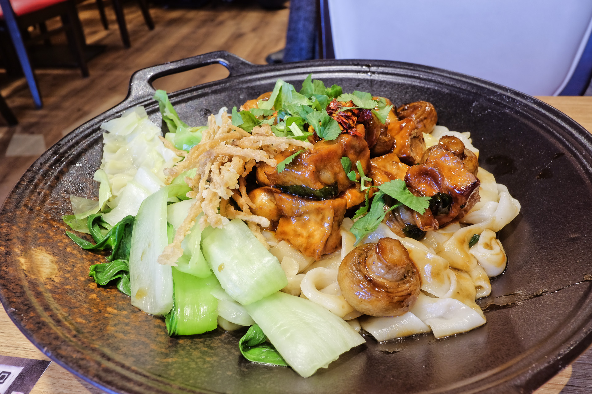 Handgemachte Biang Biang Nudeln, Tofu, Pak Choi, Spitzkohl, Ingwer, gebratene Auberginen, Enoki Pilze, hausgemachte Sojasauce und Chili Öl