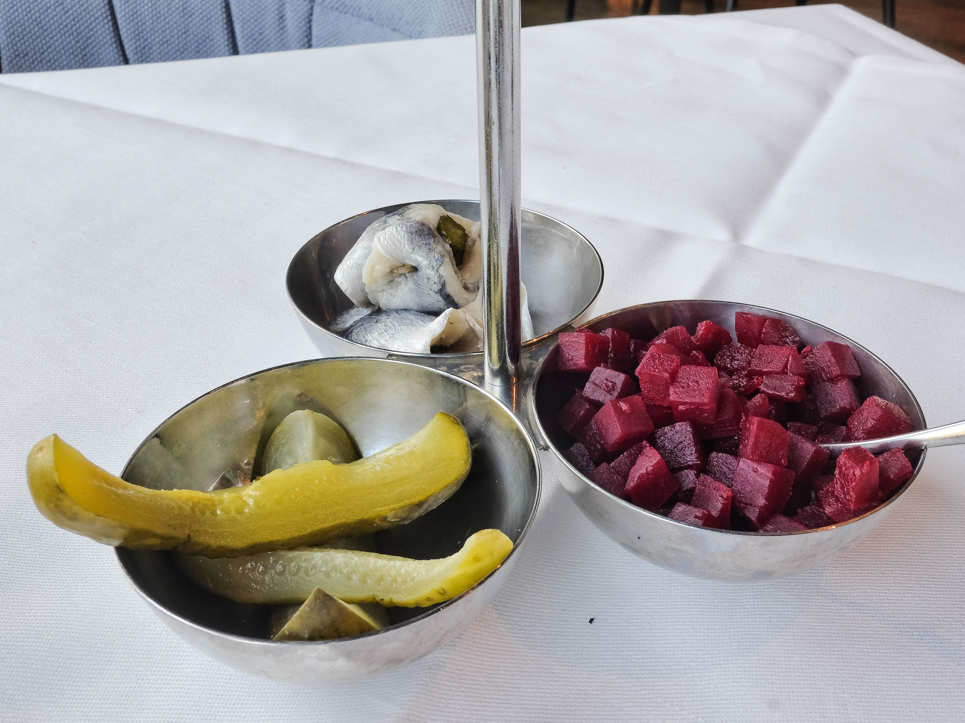 Separat gereicht wurden drei Rollmöpse, Gewürzgurken und Rote Beete. Die Roten Beete waren leicht säuerlich und hatten eine feine Textur, sie hätten aber etwas aromatischer sein können. Sehr lecker.
