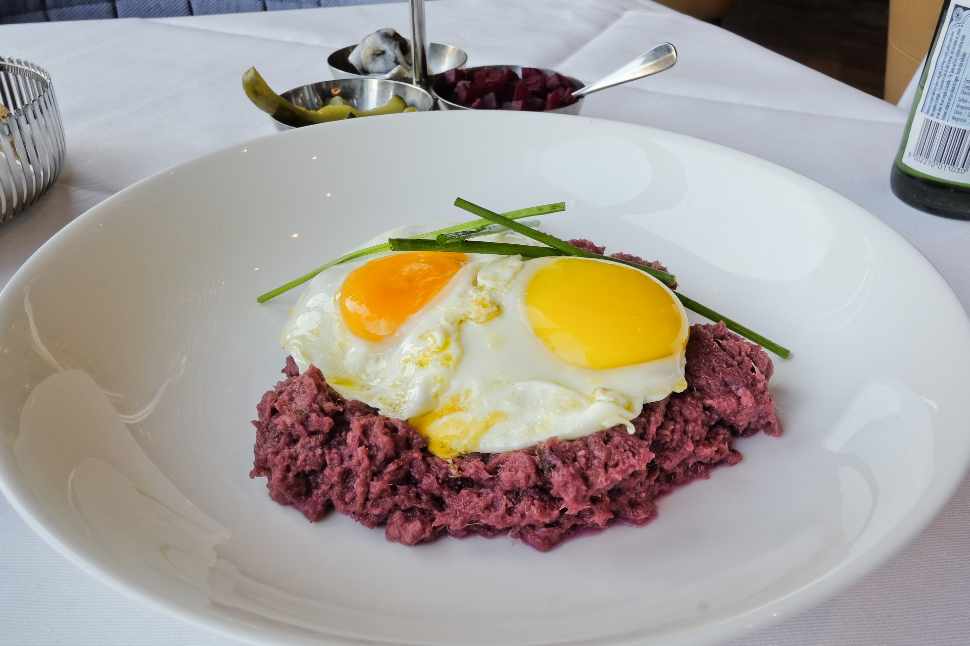 Das Labskaus hatte eine locker zarte Textur und ein feines Aroma. Dazu gab es zwei Spiegeleier. Sehr lecker.