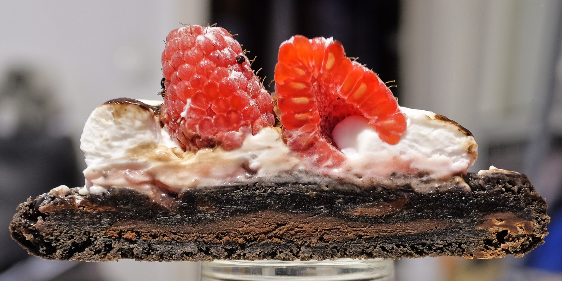 Der Cookies hatte eine leicht zähe pappige Textur und ein leicht schokoladiges Aroma. Dazu gab es eine eher neutrale feste Creme und aromatische Himbeeren. Gerade noch sehr lecker.