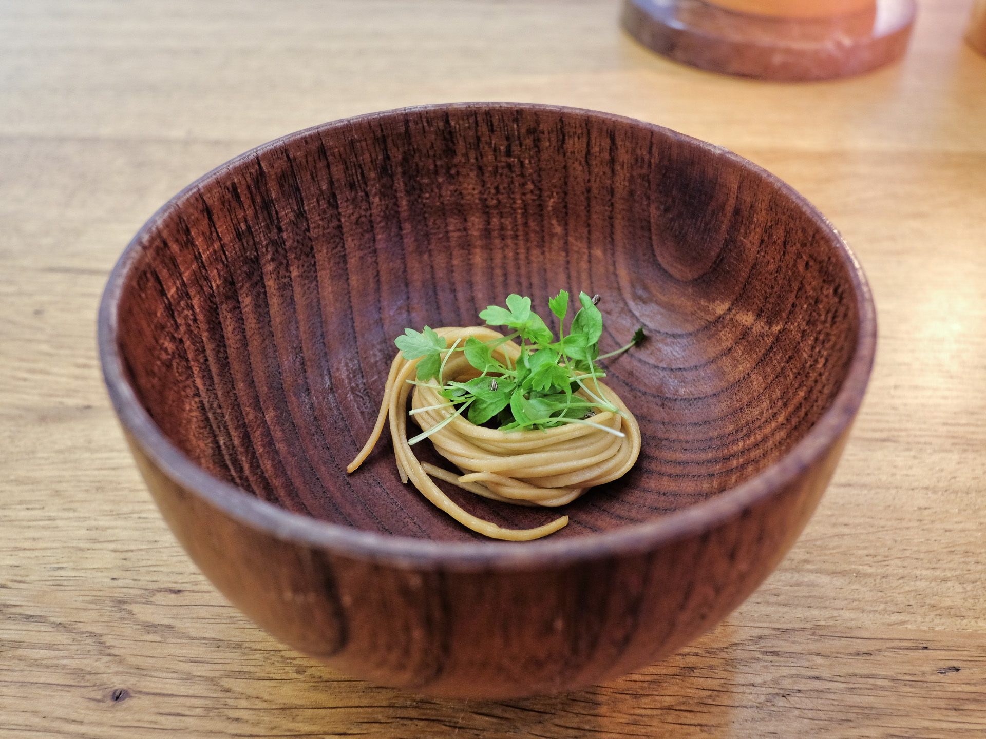 Rosöl ist ein Gericht der polnische Küche, ursprünglich eine Hühnersuppe wurde sie hier aber als vegetarische Variante gereicht. Sie hatte ein feines, leicht süßliches Aroma, zubereitet wurde sie mit Liebstöckel und Käserinde. Dazu gab es perfekt al dente Nudeln. Sehr lecker.
