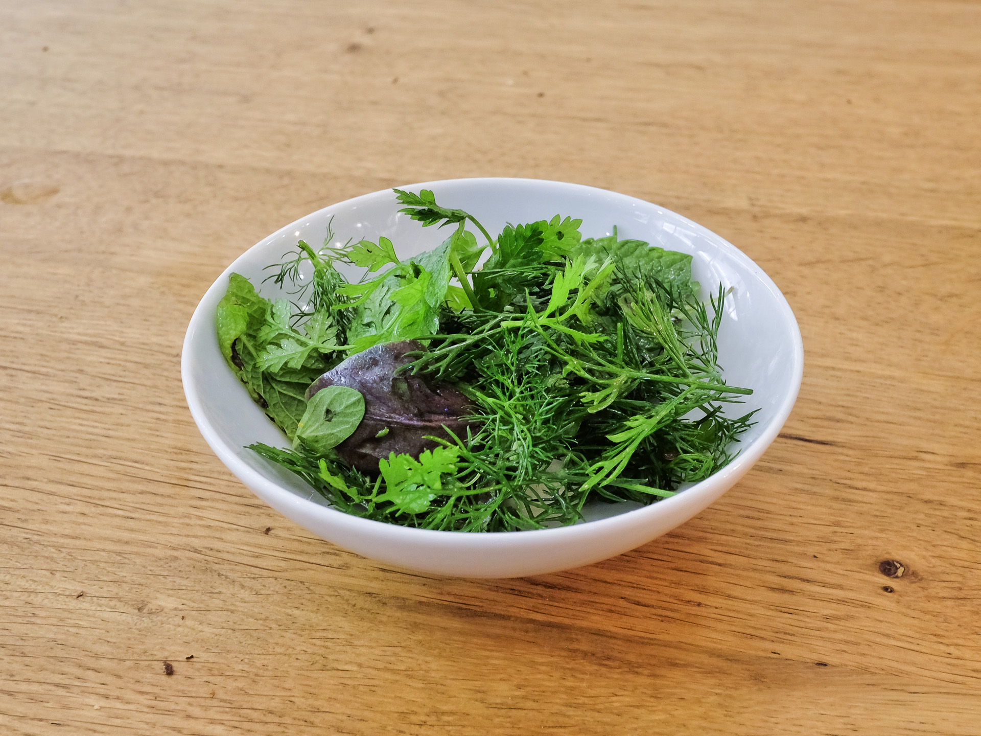 Die Kräuter waren auf einer Sonnenblumecreme angerichte, dazu gab es eine Knoblauch Vinaigrette. Sehr lecker.