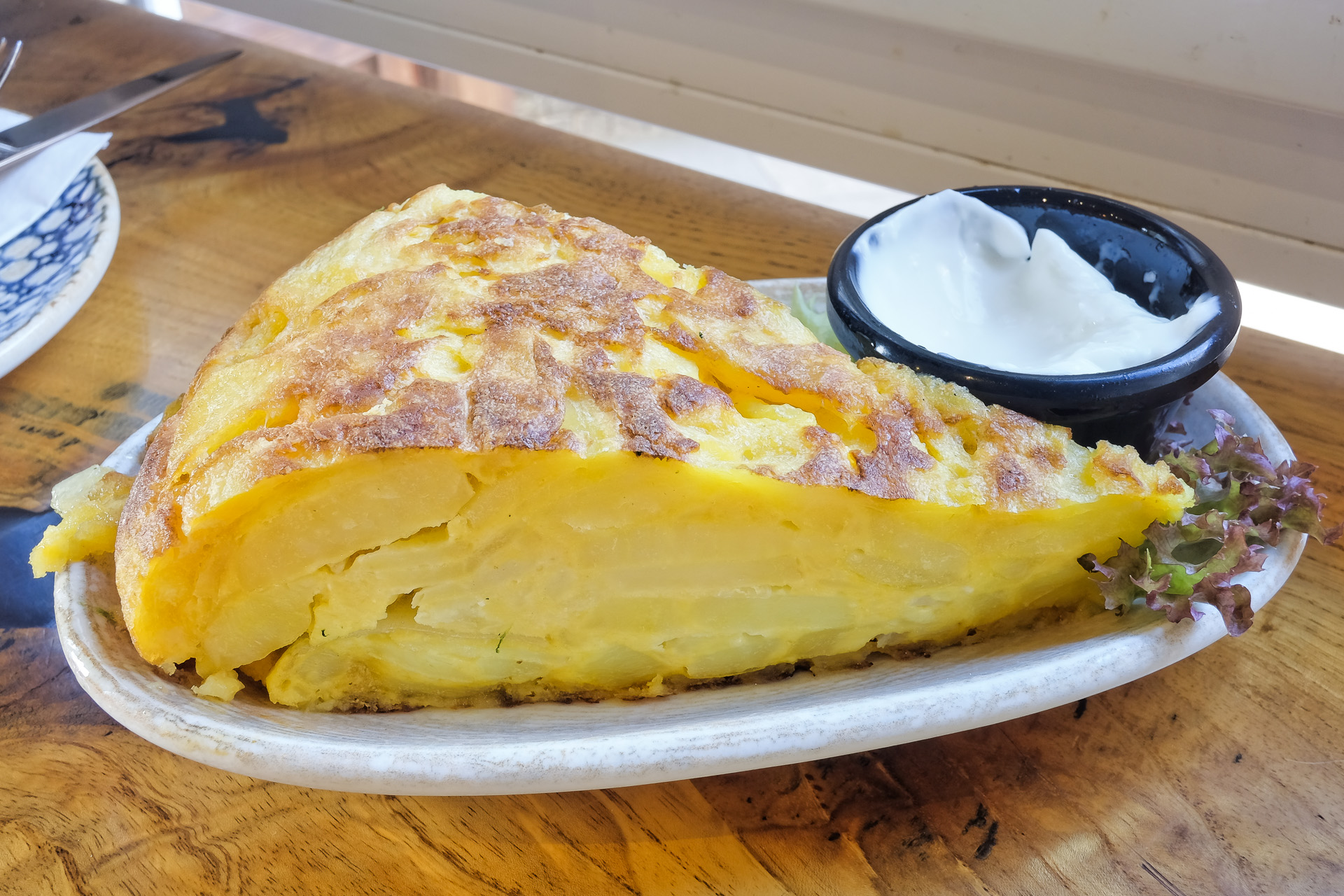 Die Tortilla de patatas aus Kartoffeln und Hühnerei war zart und hatte ein feines Aroma, sie war aber auch etwas eintönig (sehr lecker). Dazu gab es eine Art Aioli (?) mit wenig Aroma, gerade noch sehr lecker.