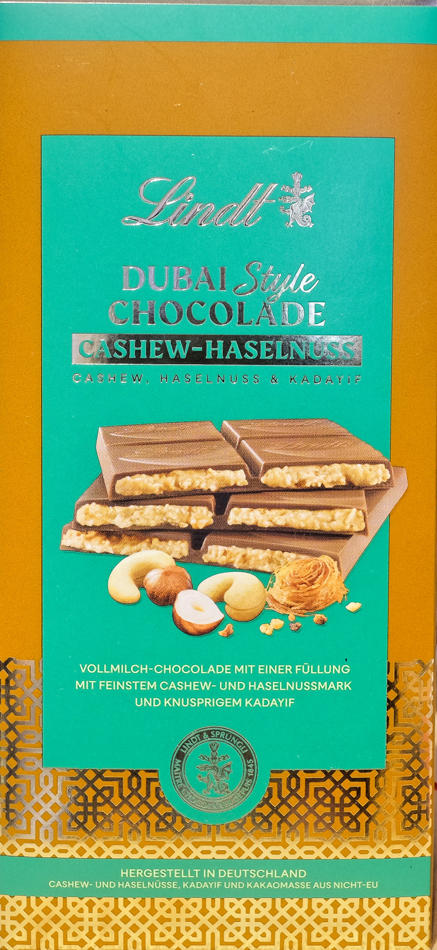 Lindt - Dubai Style Chocolade Cashew-Haselnuss Gefüllte Vollmilch-Schokolade mit Cashewkern-Haselnuss-Engelshaar-Füllung (22 %)