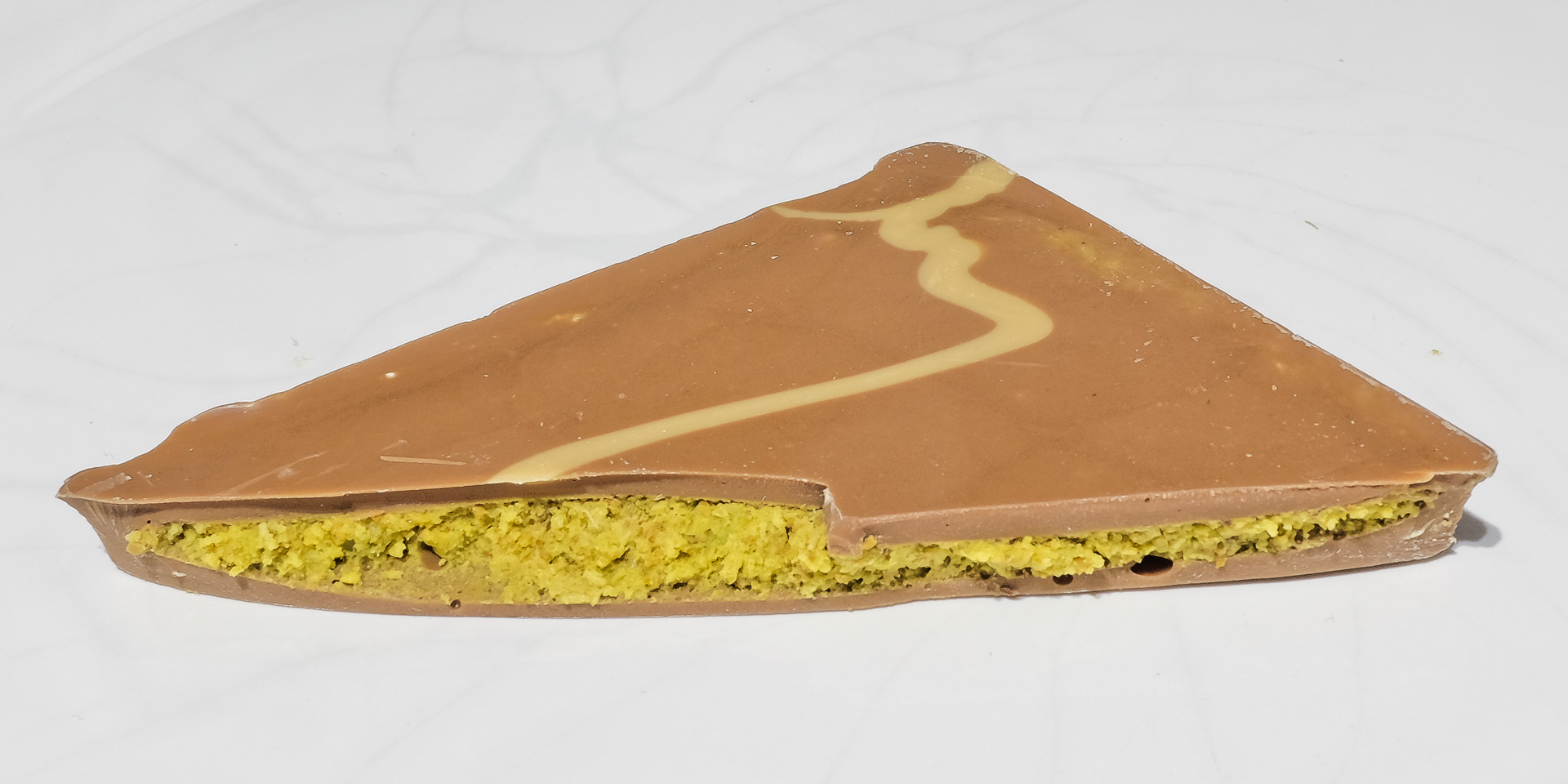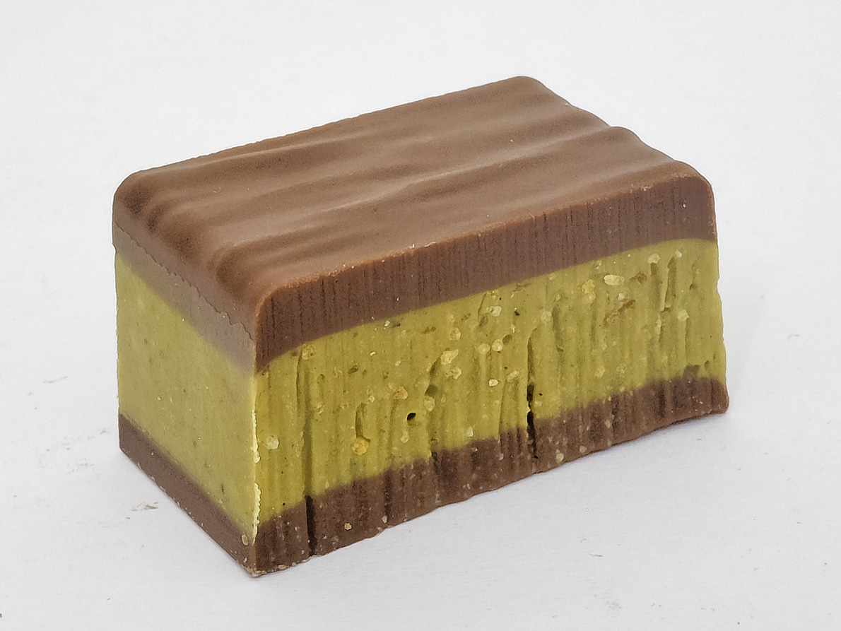 Eine raffinierte Praline, bestehend aus zwei Schichten Milchschokolade mit einer Füllung aus Pistazienpraliné und Kadaif-Stückchen für eine knusprige Textur.