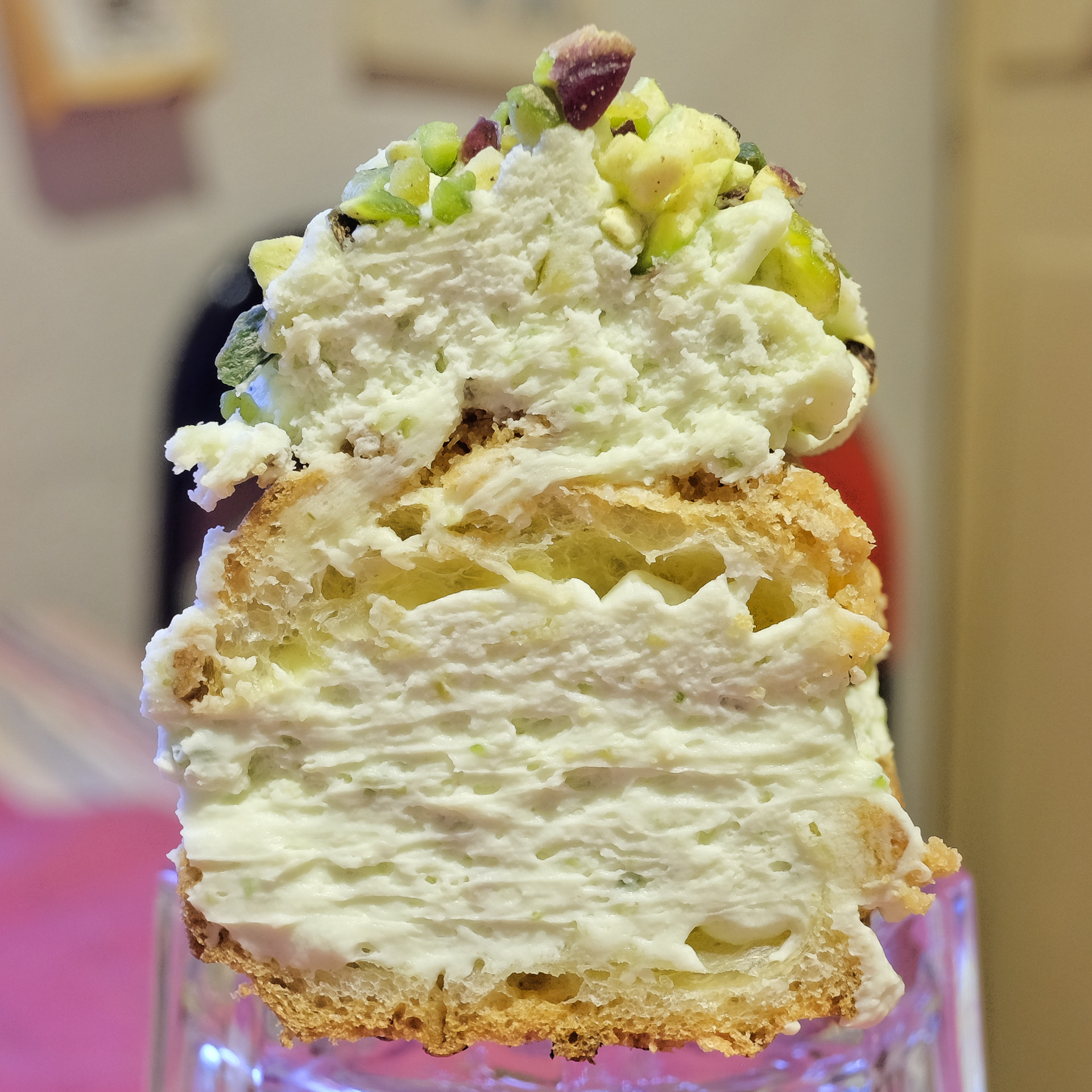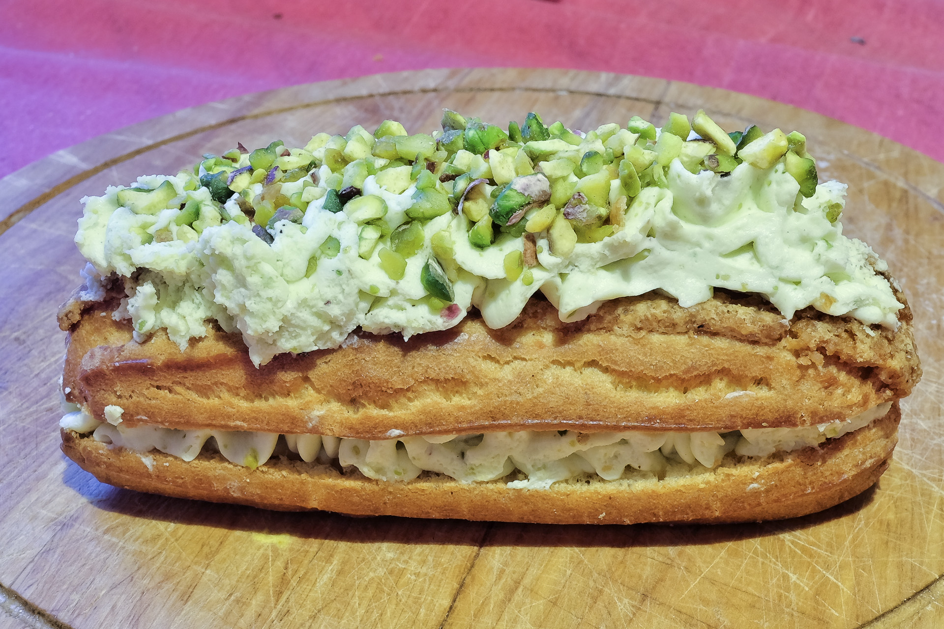Das Eclair war zart und aussen leicht kross, er erinnerte ein bisschen an Löffelbiskuits, gefüllt war er mit einer Creme mit Pistazien und einem Topping mit Pistazien. Sehr lecker.