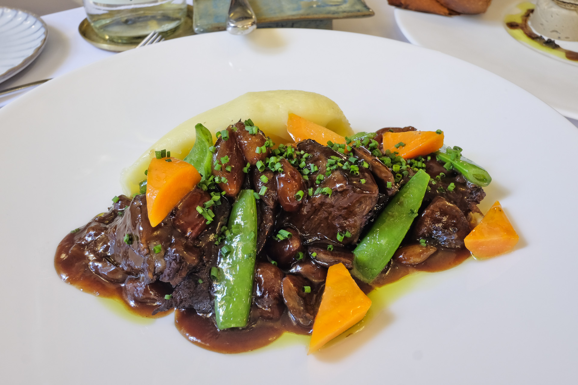 Das Bœuf Bourguignon ist ein Klassiker der französischen Küche. Das in Rotwein und Portwein geschmorte Rindfleisch hätte etwas zarter sein können. Der Jus enthielt Perlzwiebeln und geräucherten Speck und hatte ein (zu) intensives, rauchig säuerliches Aroma. Der Fleischgeschmack ging dabei etwas unter. Dazu gab es Karotten, grüne Bohnen und ein Kartoffelpüree. Gerade noch sehr lecker.