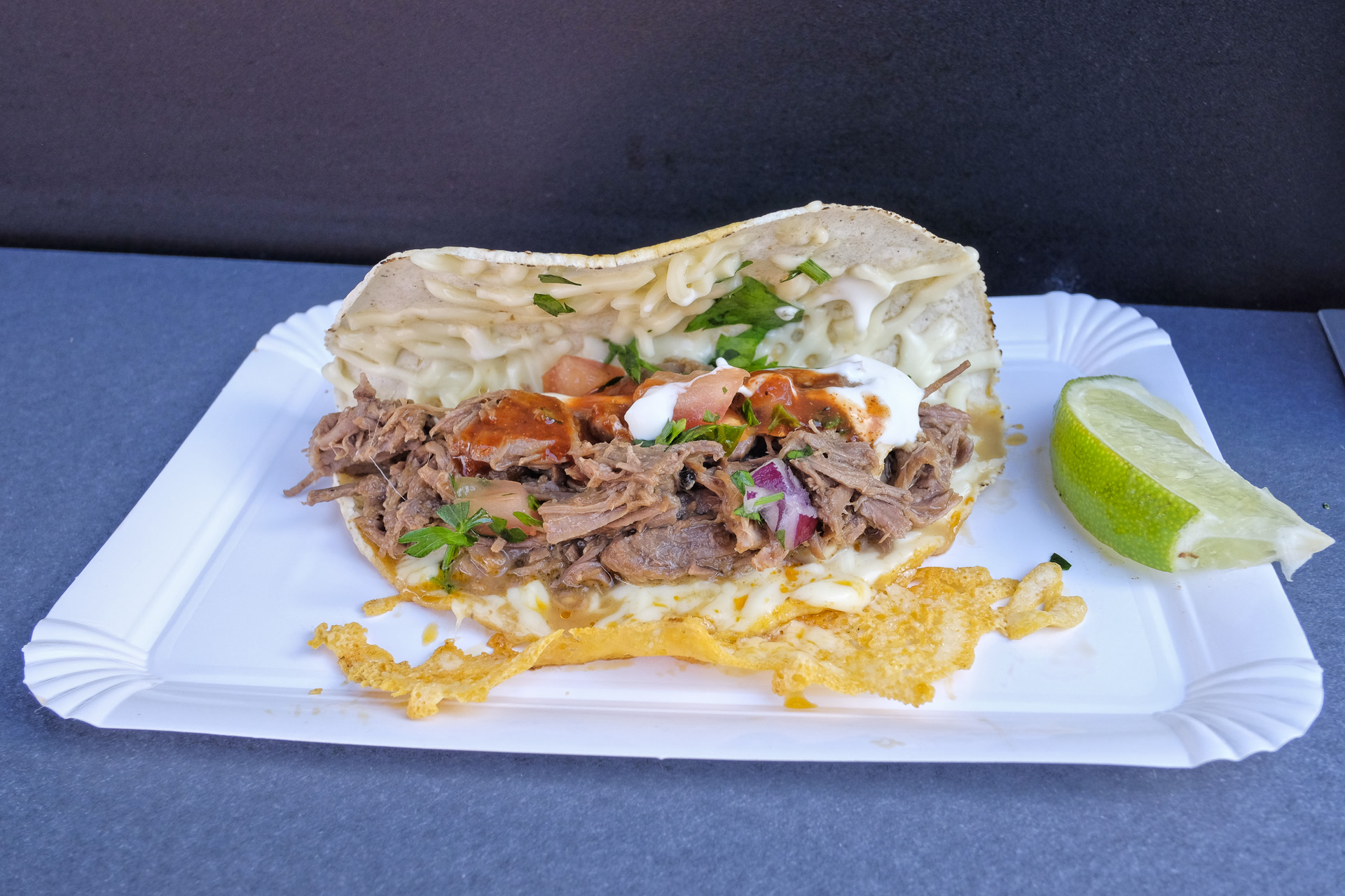 Die Tortilla war mit Pulled Beef, Tomaten, Zwiebeln, Käse, zweierlei Saucen und Koriander belegt. Ein schöner Taco, sehr lecker.