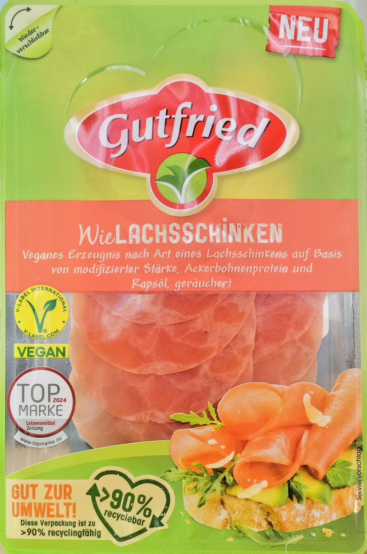 Veganes Erzeugnis auf Basis von modifizierter Stärke, Ackerbohnen und Rapsöl, nach Art eines Lachsschinkens, geräuchert (Zitat Gutfried)