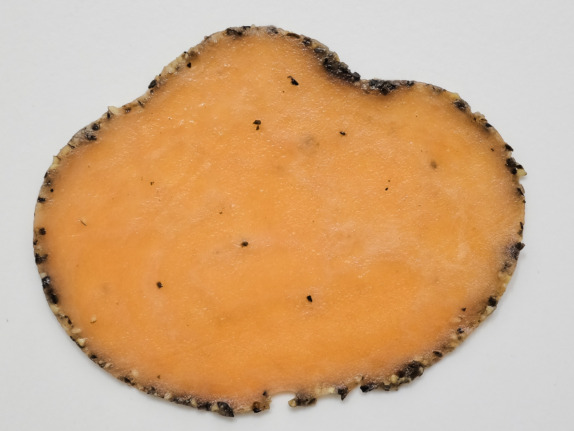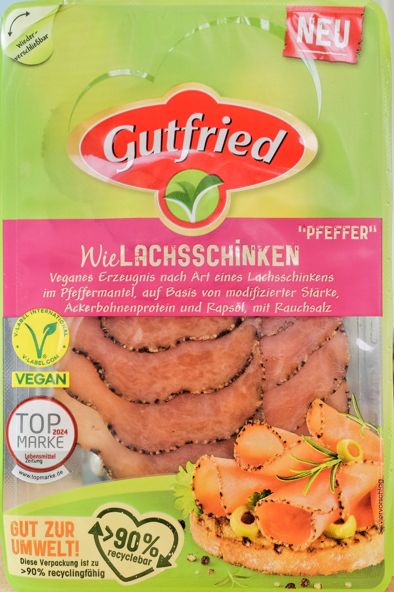 Veganes Erzeugnis auf Basis von modifizierter Stärke, Ackerbohnen und Rapsöl, nach Art eines Lachsschinkens im Pfeffermantel, geräuchert (Zitat Gutfried)