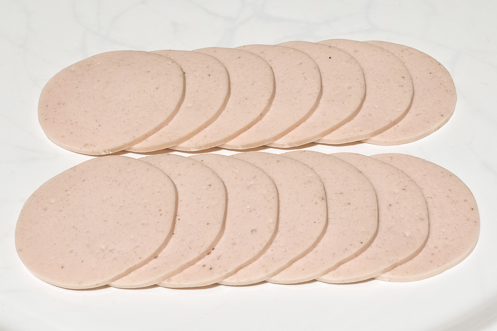 | Zutaten | Trinkwasser, modifizierte Stärke (5,9 %), Ackerbohnenprotein (3,4 %), Trehalose, Verdickungsmittel: Carrageen, Johannisbrotkernmehl, Konjak; Speisesalz, Rapsöl (0,7 %), Reis Mehl, schwarzer Pfeffer, natürliche Aromen, Mais Stärke, Citrusfasern, Rauchsalz (Speisesalz, Rauch), färbende Lebensmittel: Paprikasaft Konzentrat, Rote Beete Saft Konzentrat, Süßkartoffelpulver; Festigungsmittel: Kaliumchlorid; Säureregulator: Natriumacetate. |