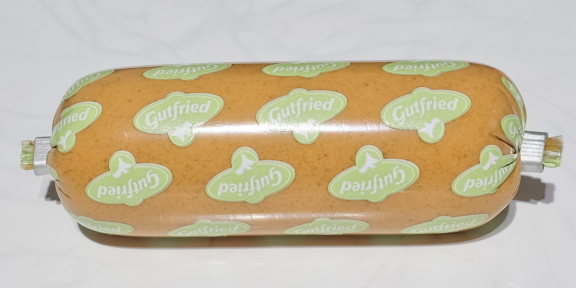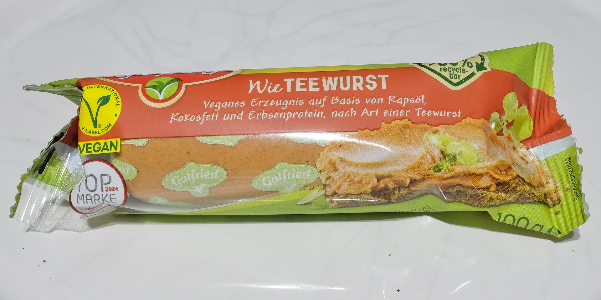 Veganes Erzeugnis auf Basis von Rapsöl, Kokosfett und Erbsenprotein, nach Art einer Teewurst (Zitat Gutfried)