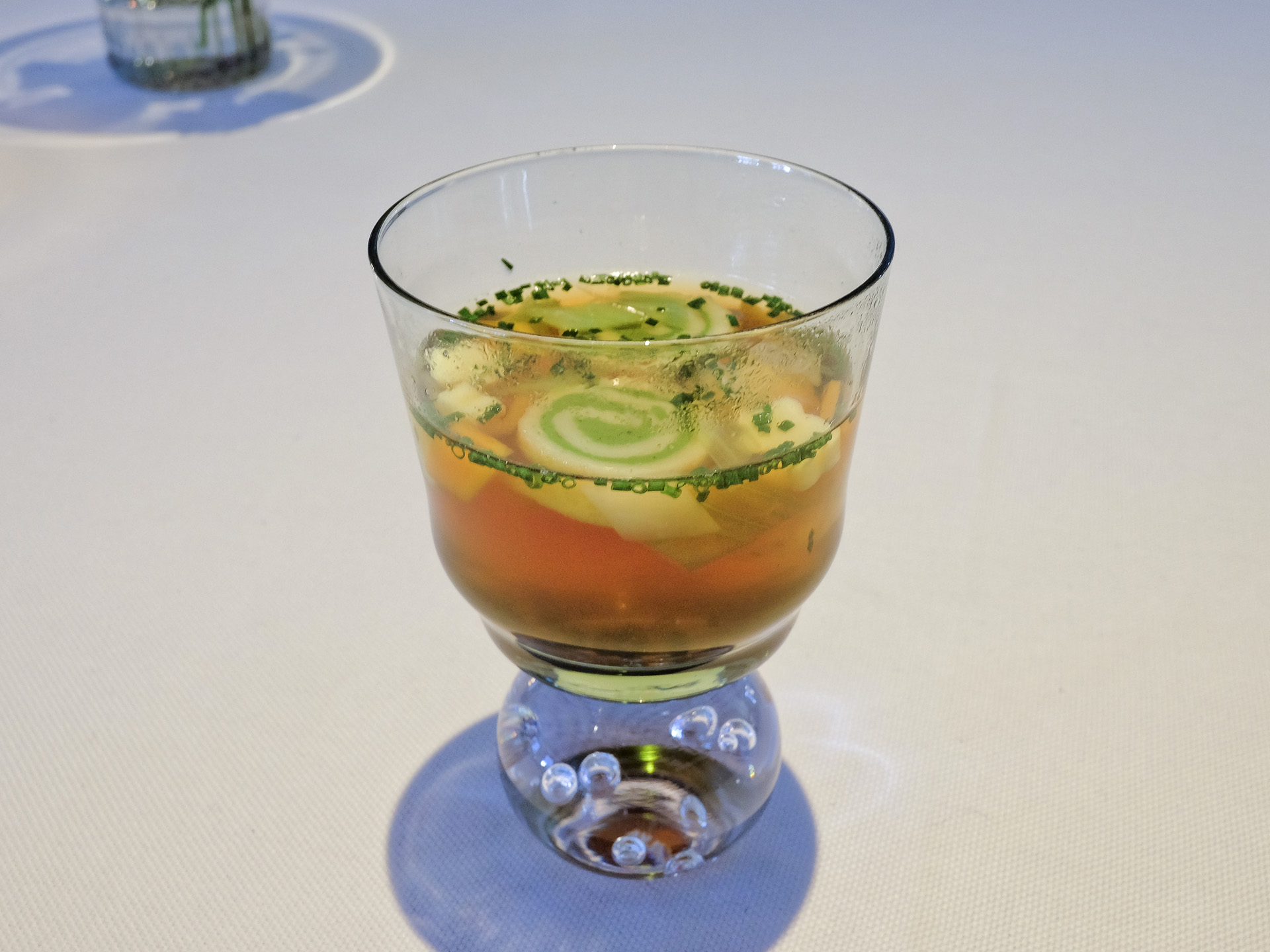 Das letzte Amuse Gueule war eine Consomme Double vom friesischen Wagyu Rind mit Markklößchen, Eierstich, einer Creperoulade und feine Gemüse Brunoise. Die Consomme war heiß, duftend, vollmundig und hatte ein feines Aroma. Sehr lecker. Klasse.