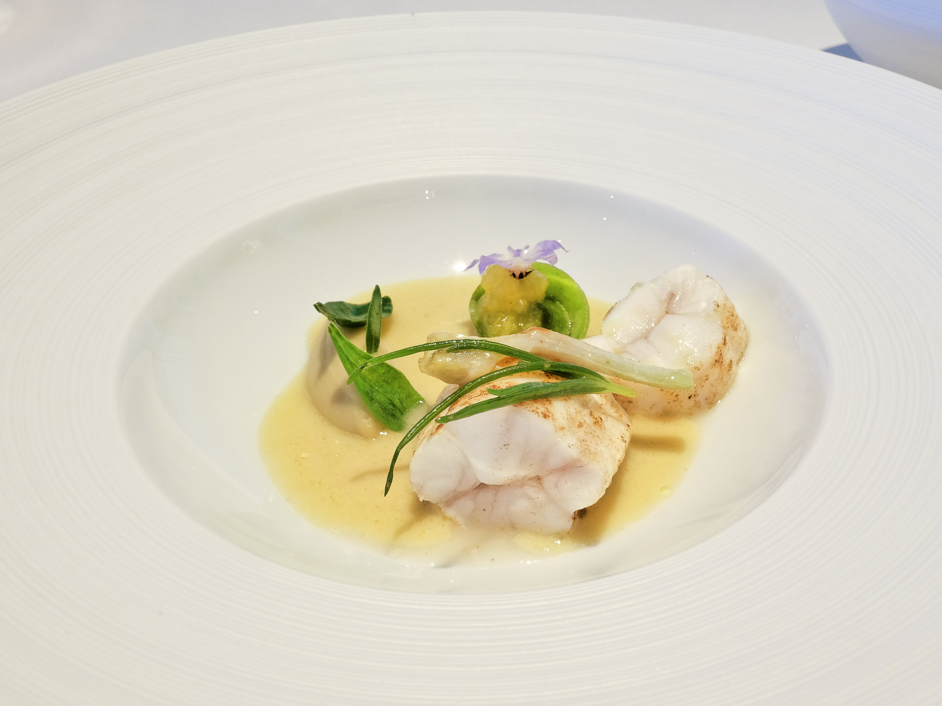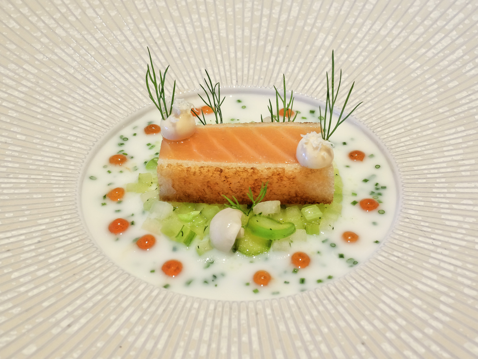Der Lachs von der Isle of Mull war sehr zart mit fester Textur und feinem Aroma, flankiert wurde er von zwei dünnen Toastscheiben als eine Art Sandwich. Dazu gab es eine Buttermilch Sauce mit Gurke, Erbsen, Lachs Kaviar, etwas Marie Rose Sauce und etwas Dill. Sehr lecker.