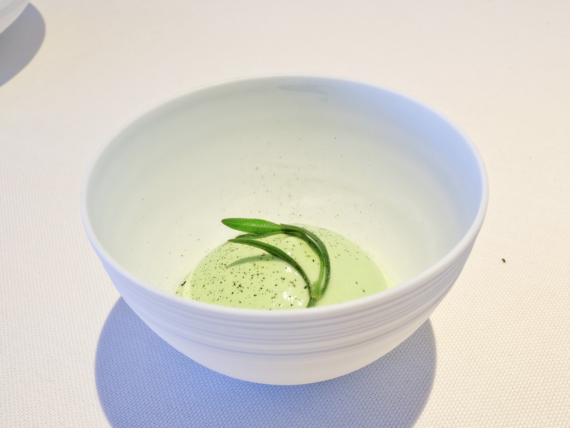In der Schale waren Clery Erdbeeren mit einem Weizengras Granite und einem Quarkschaum angerichtet. Die Erdbeeren waren aromatisch und der Quarkschaum hatte eine feine Textur. Sehr lecker, Klasse.