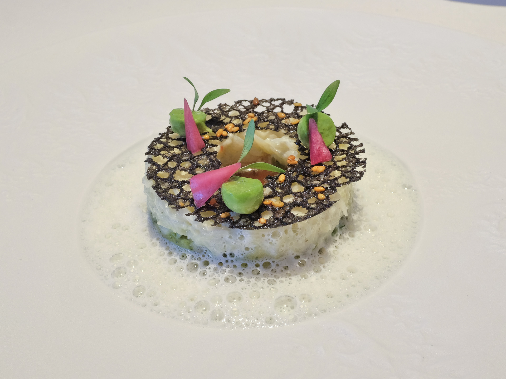 Der gezupfte Taschenkrebs war zart und hatte ein feines Aroma, angerichtet war auf auf einer Apfel Avocado Ceviche. Dazu gab es in der Mitte eine Krustentier Reduktion und aussen einen Limetten Kefir. Bedeckt war der Taschenkrebs mit einer mit Sepia Tinte gefärbten Hippe und ein paar Avocado Perlen. Ein schönes vielschichtiges Gericht, sehr lecker, Klasse.
