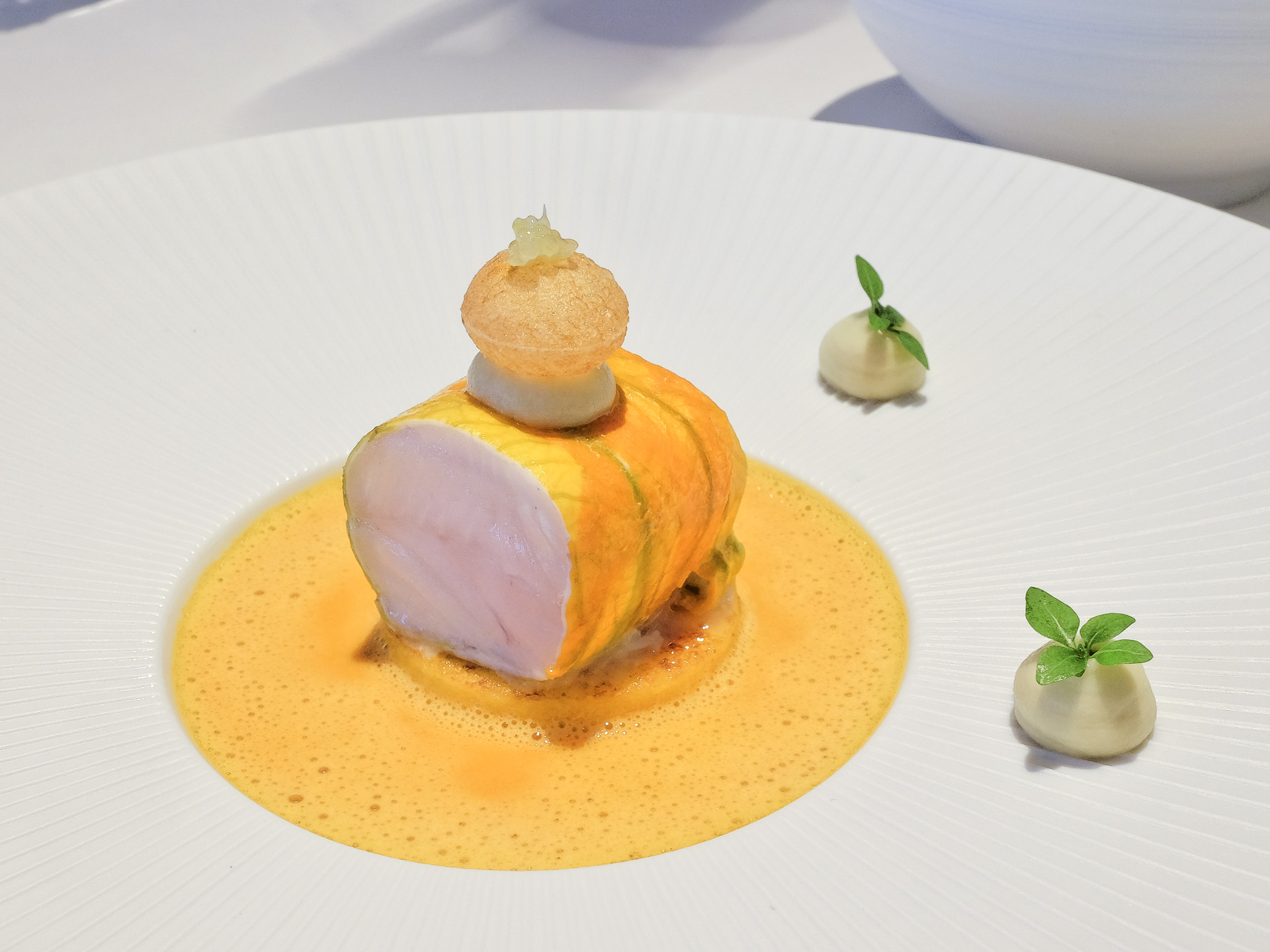 Der von einer Zucchiniblüte umhüllte Petersfisch war zart und hatte ein feines Aroma. Angerichtet war er auf einem Ring aus gerösteter Polenta. Dazu gab es etwas Fenchelcreme, Pommes Souffle, Finger Limes und einen wunderbar aromatischen Paprika Schaum mit feiner Säure. Sehr lecker, Klasse. Die Paprika Sauce wurde noch in einer kleinen Kasserolle bereitgestellt.