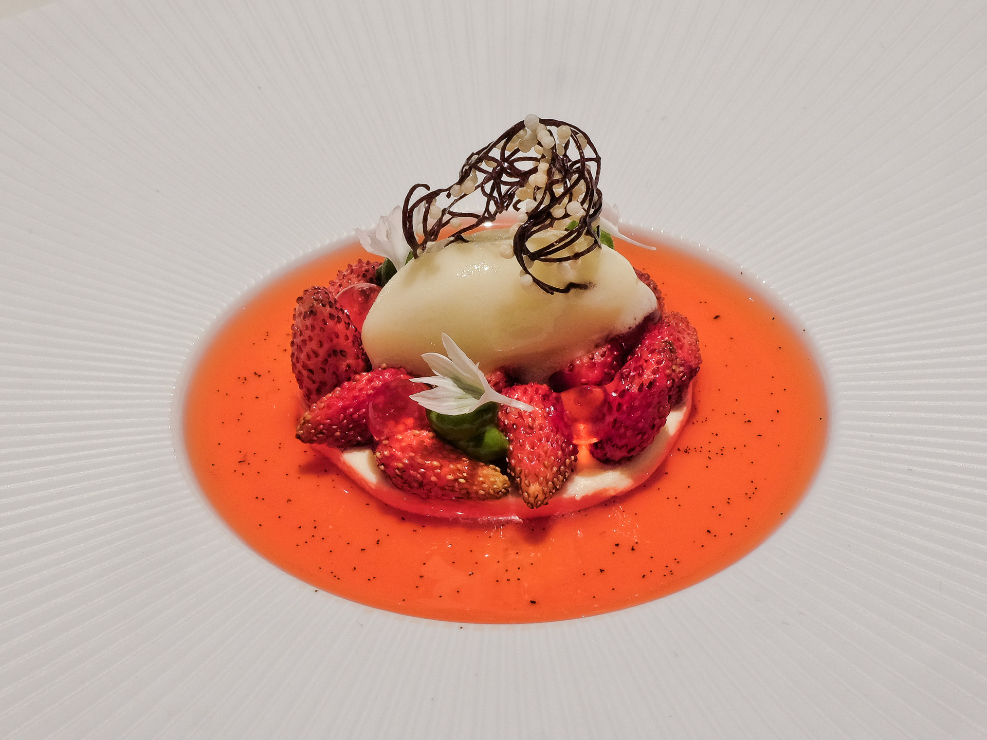 Beim zweiten Dessert ging es um das Thema Erdbeeren. Auf einer Hafer Ganache waren aromatische Walderdbeeren angerichtet, Dazu gab es Tupfer aus Erdbeer- und Fichten Gel und ein Holunderblüten Sorbet. Ein sehr feines Aroma, sehr lecker, Klasse.
