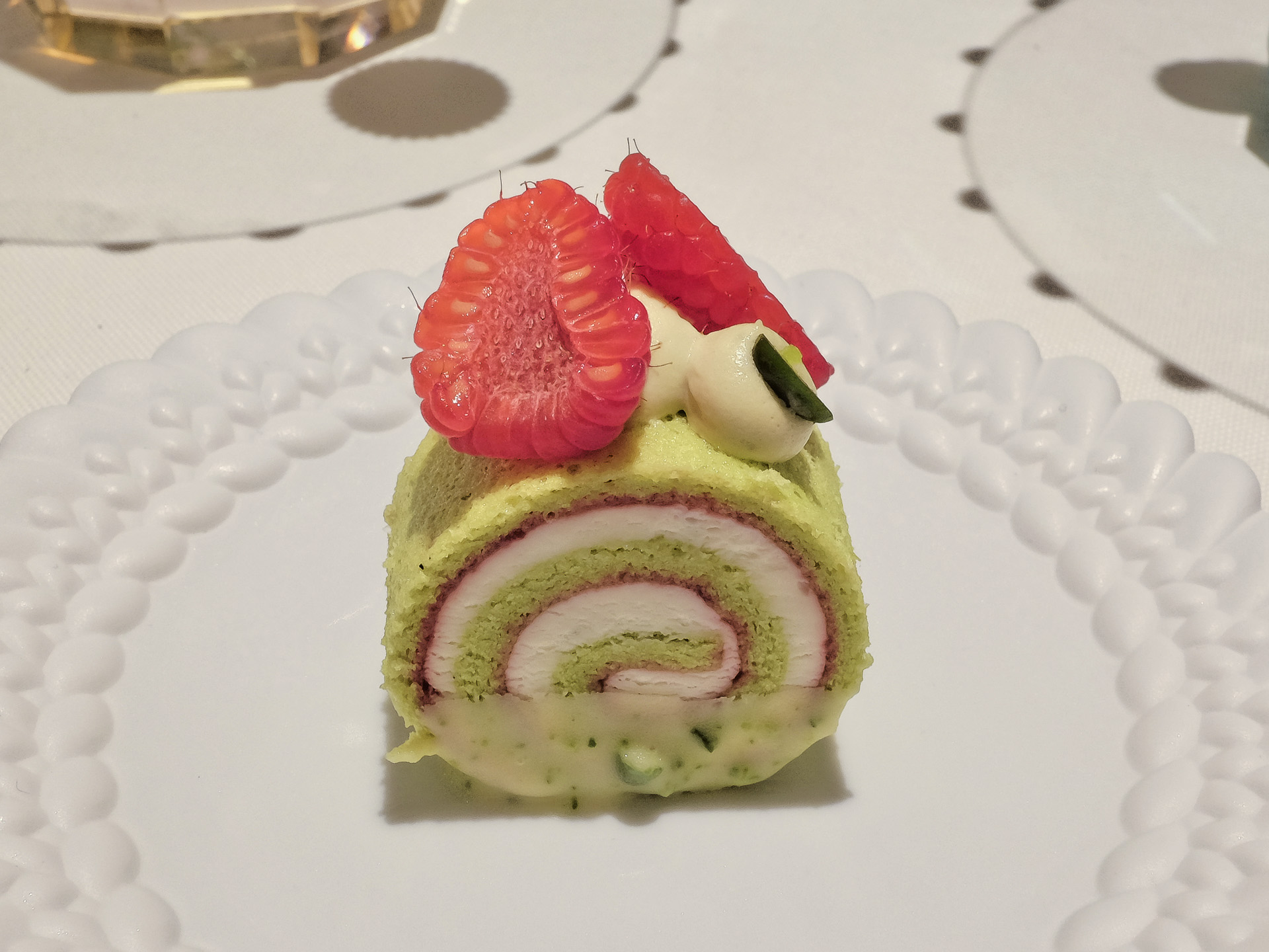 Eine Pistazien Biskuitrolle mit Himbeeren, sehr lecker.