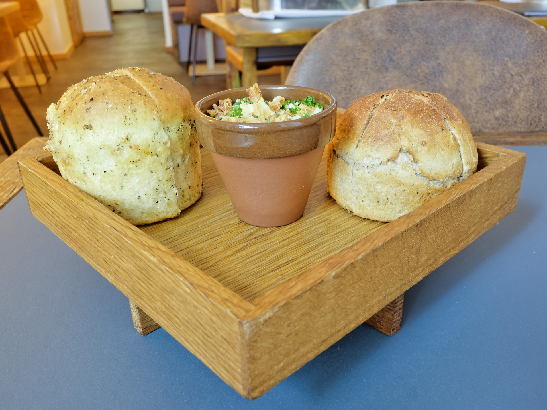 Vor dem Essen wurde etwas Brot und Focaccia gereicht. Dazu gab es diesmal einen Dip auf der Basis einer französischen Zwiebelsuppe. Eine originelle Idee mit feinem Aroma. Bedeckt war der Dip mit essbaren Blüten, Käse und Röstzwiebeln. Sehr lecker, Klasse.