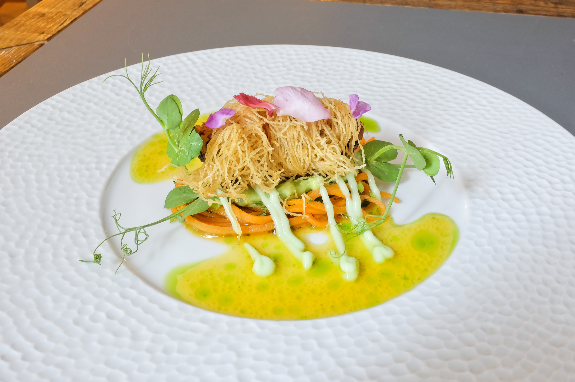 Die Argentinische Rotgarnele war von Engelshaar umhüllt und lag auf einem Bett aus Avocado Tatar und knackige Karotten Spaghetti. Dazu gab es etwas Jalapeno Mayonnaise und eine Passionsfrucht Vinaigrette mit leichter Säure und feiner Süße. Eigentlich ein sehr schönes Gericht, Engelshaar und Karotten bildeten texturell einen schönen Kontrast. Durch das Engelshaar war die Rotgarnele leider ziemlich übergart und konnte seine Qualitäten nicht zeigen. Sehr lecker.