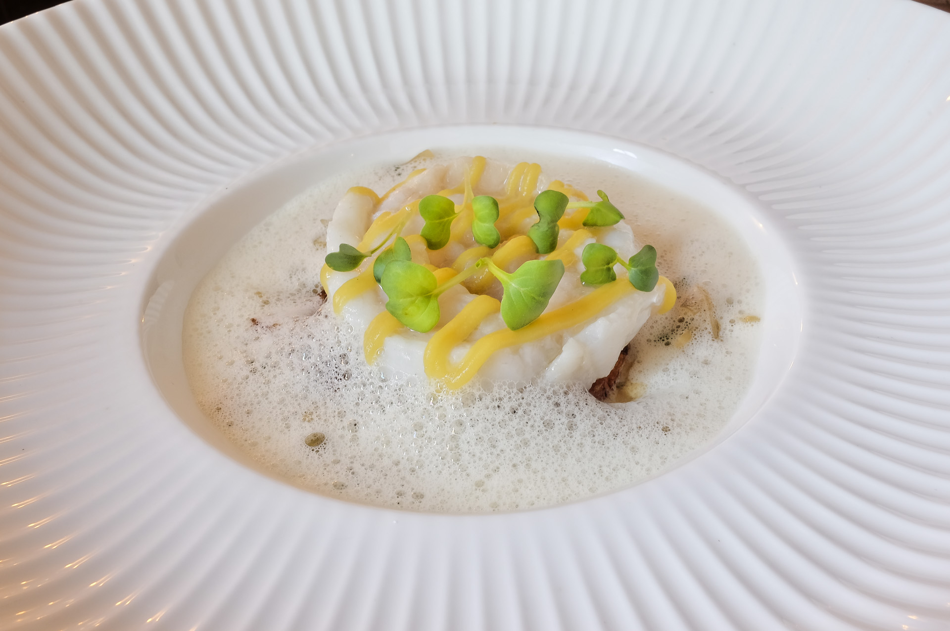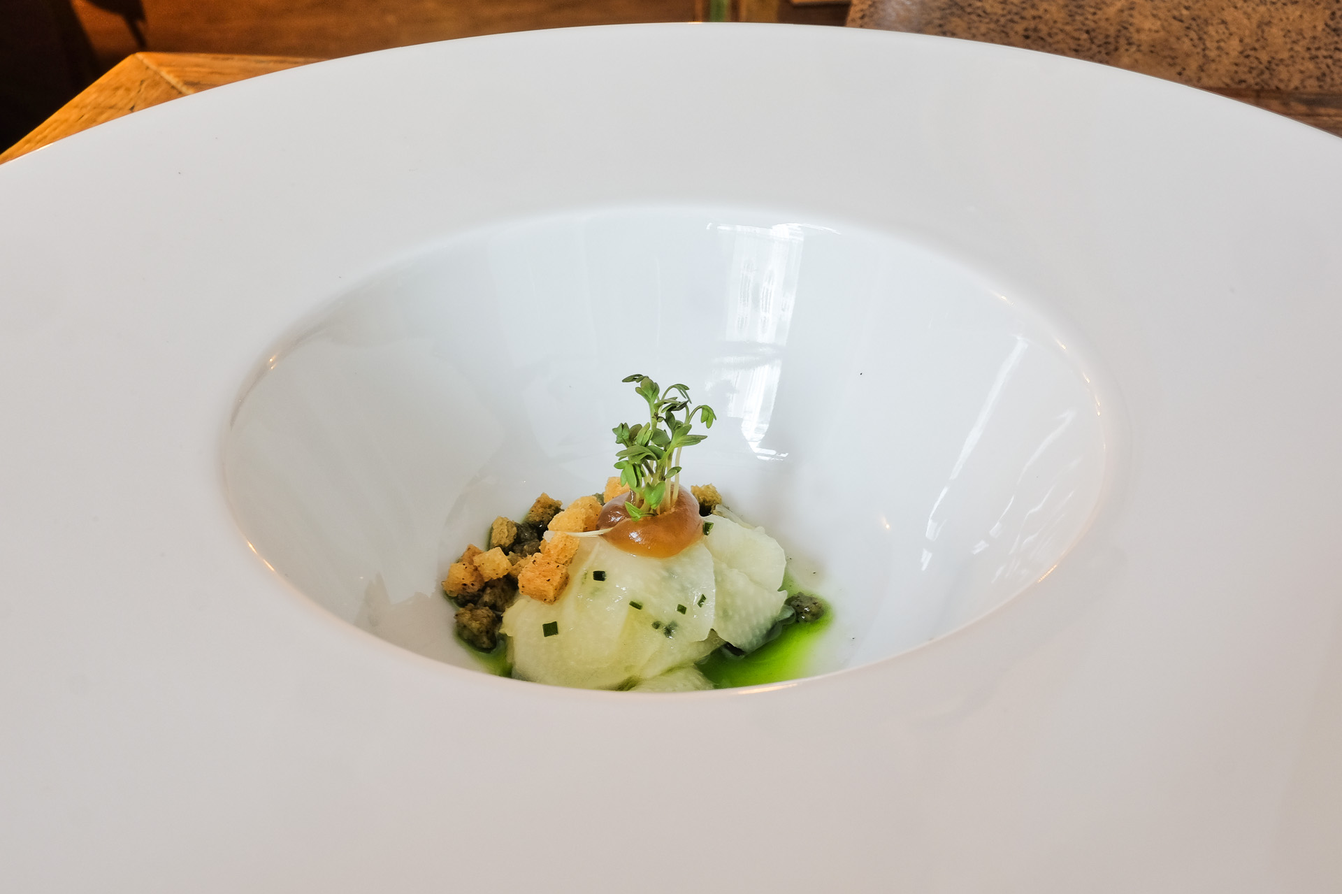 Der Steinbeißer war zart, leicht glasig und hatte ein feines Aroma. Er lag auf einem Bett aus Bayrisch Kraut und einem Kartoffel Rösti. Dazu gab es etwas Dashi, einen Bayrisch Kraut Schaum und eine Senfcreme. Das Bayrisch Kraut hatte ein feines Aroma und der leicht knusprige Rösti bildete einen schönen Kontrast. Sehr lecker.