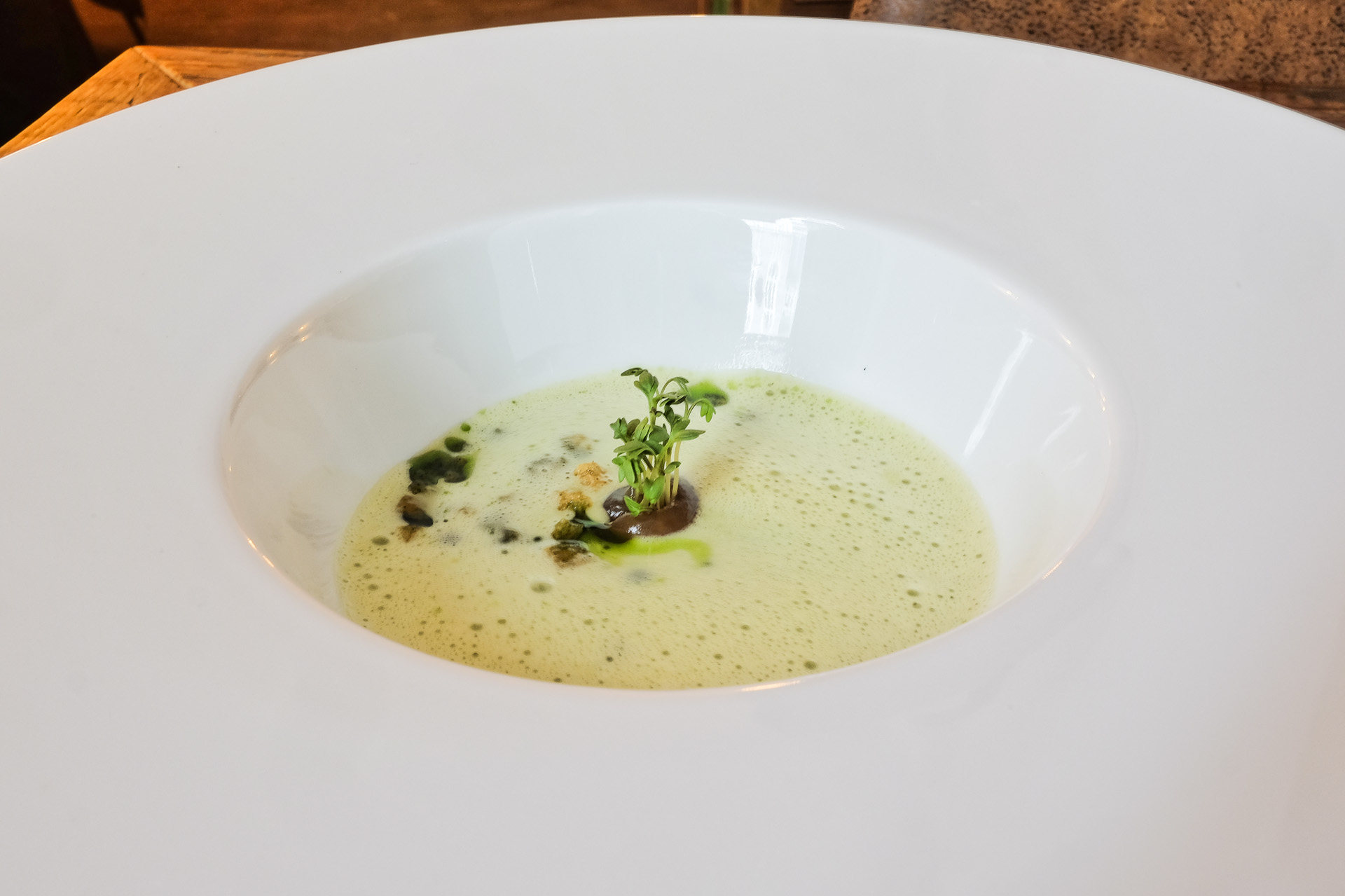 Auf dem Teller waren dünne Spargelscheiben, kleine Croutons, etwas Ponzu Gel, Gartenkresse und Schnittlauch Öl angerichtet. Angegossen wurde ein Samtsüppchen vom Frühlingslauch. Der Spargel war leicht knackig und das Samtsüppchen hatte eine feines elegantes Aroma. Ein schönes Gericht, sehr lecker.