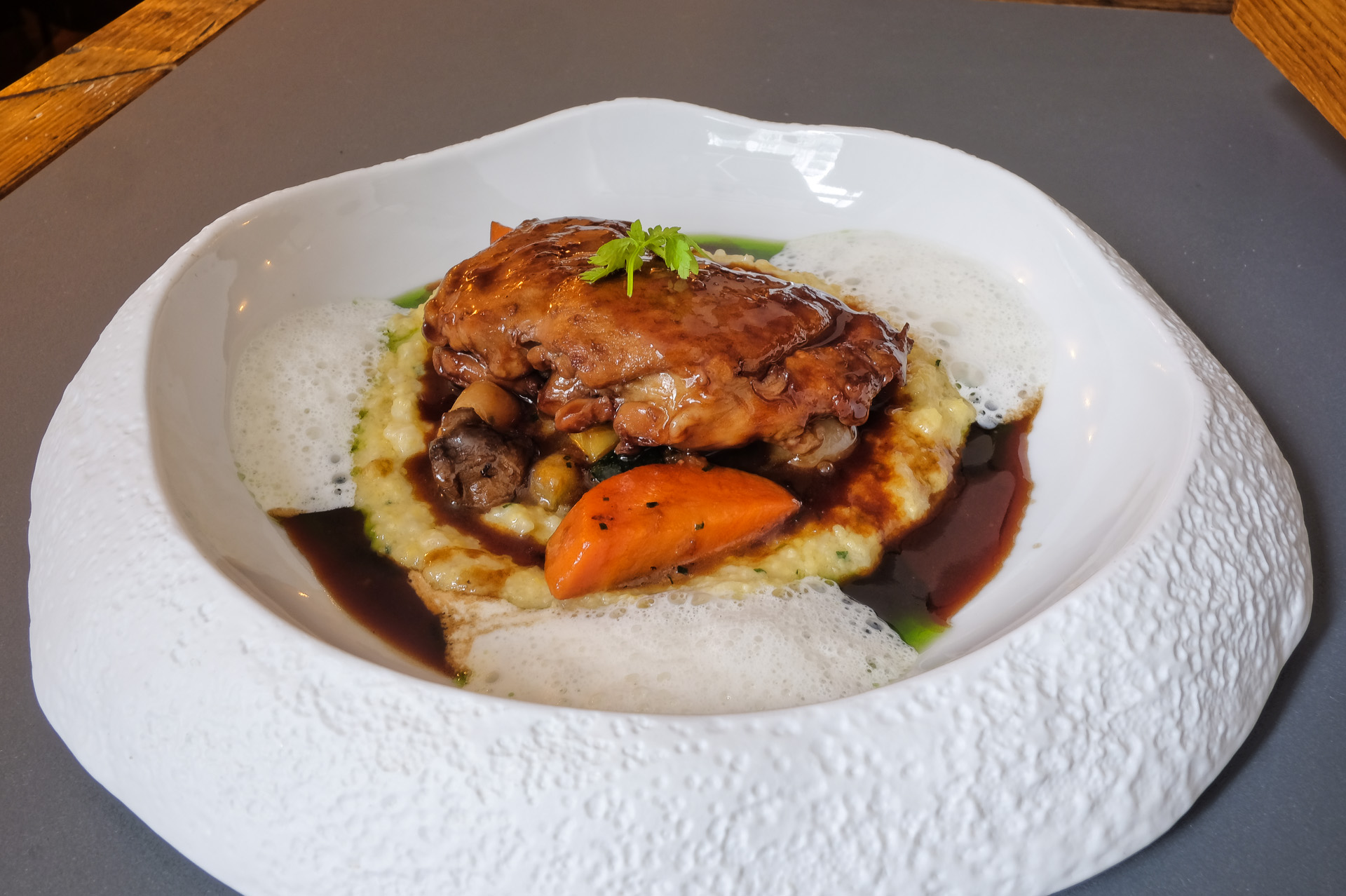 Das Coq au vin vom Weidehuhn hätte etwas zarter und aromatischer sein können. Dazu gab es eine Polenta, geschmortes Gemüse (u.a. Karotten, Zucchini, Champignons, Perlzwiebeln), eine Spätburgunder Sauce und etwas Petersilien Öl. Gerade noch sehr lecker.
