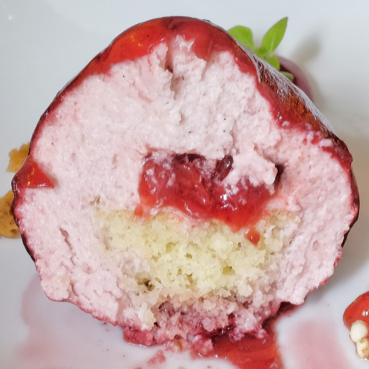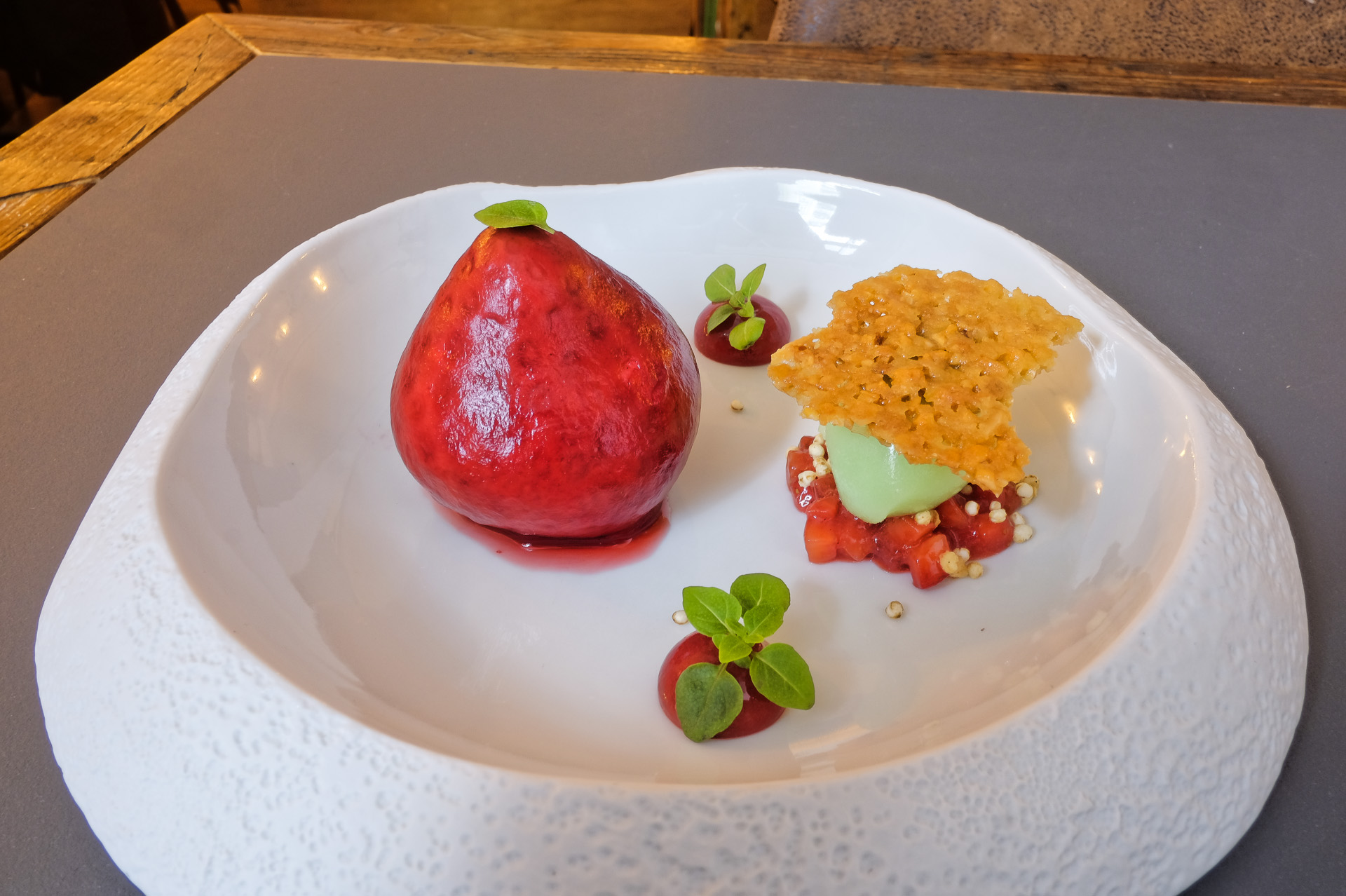 Als Dessert gab es eine "Erdbeere" aus einer Erdbeer Joghurt Mousse mit etwas Biskuit und Erdbeer Kompott. Dazu gab es ein aromatisches Basilikum Sorbet, etwas Erdbeer Gel, ein Erdbeer Ragout mit Quinoa und einen knusprigen Mandel Krokant Chip. Sehr lecker.