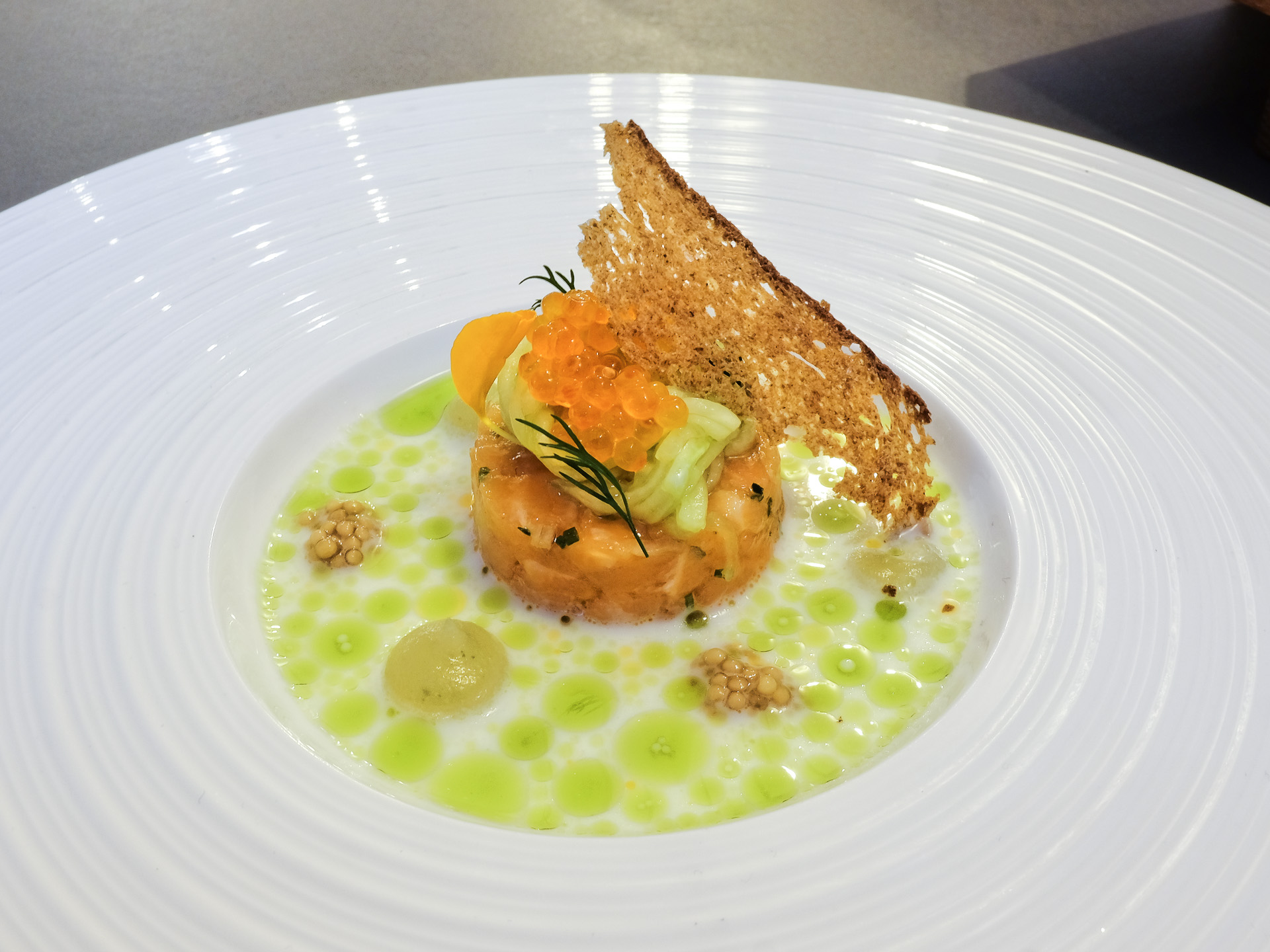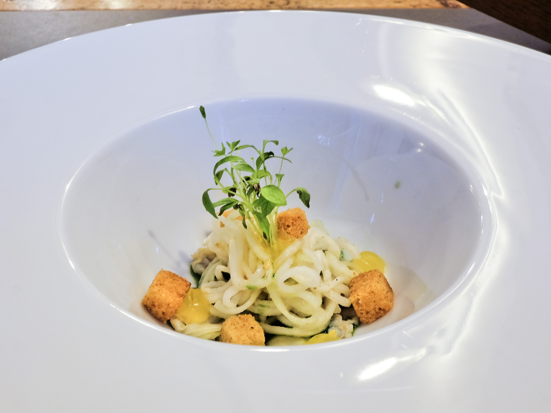 Das Tatar vom schottischen Lachs war zart und hatte ein feines Aroma. Dazu gab es Gurken "Spaghetti", eine fein säuerliche Buttermilch Vinaigrette, eingelegte Senfsaat, etwas Brunnenkresse Öl, Forellen Kaviar und einen krossen Brotchip. Sehr lecker.