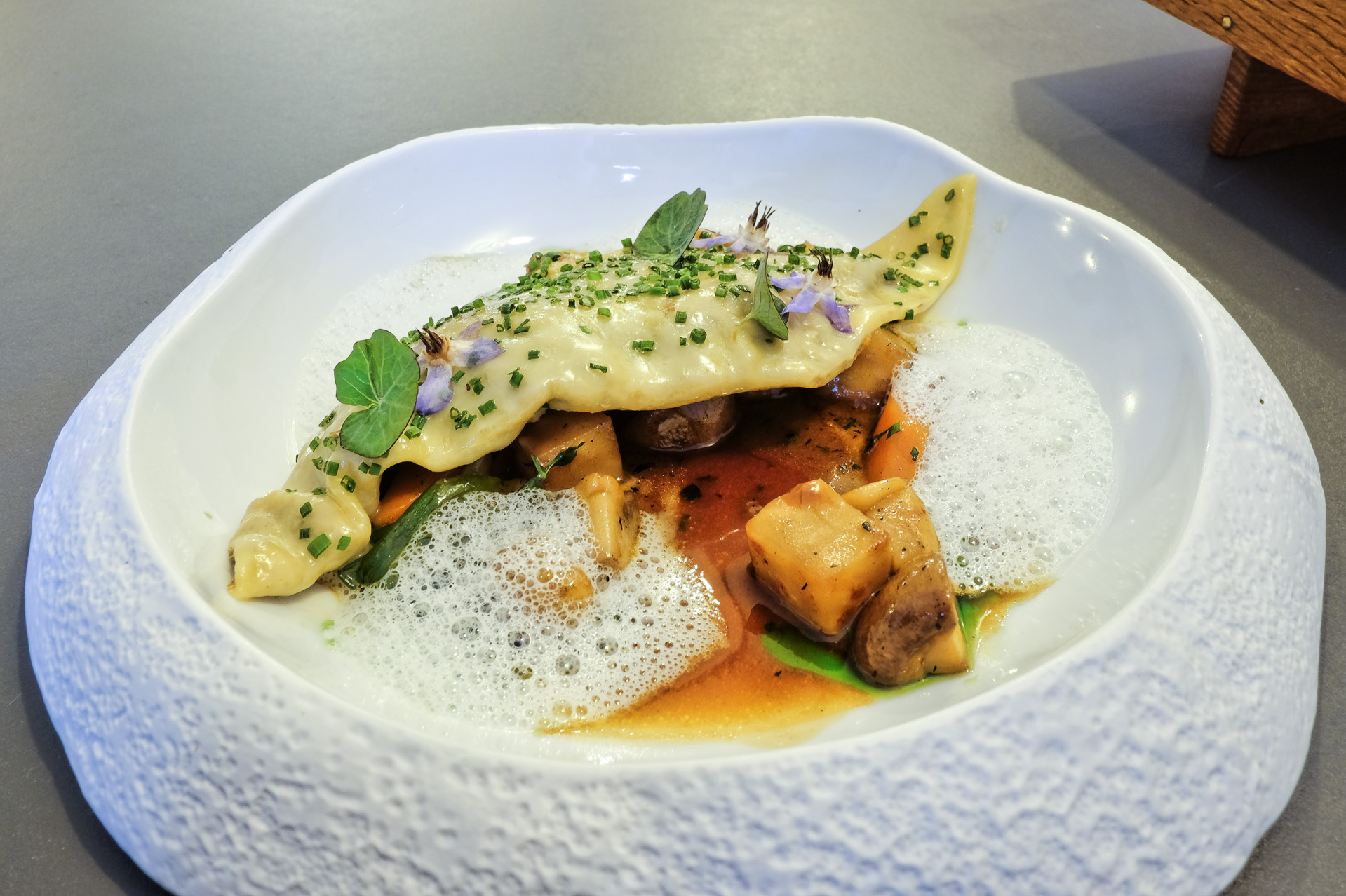 Die Maultasche war mit Ossobuco gefüllt, das Fleisch war zart und aromatisch aber etwas trocken und faserig. Dazu gab es geschmortes Gemüse (Karotten, Sellerie, Champignons, Schalotten), einen schön aromatischen Jus, etwas Liebstöckel Öl und einen Parmesanschaum, Sehr lecker.