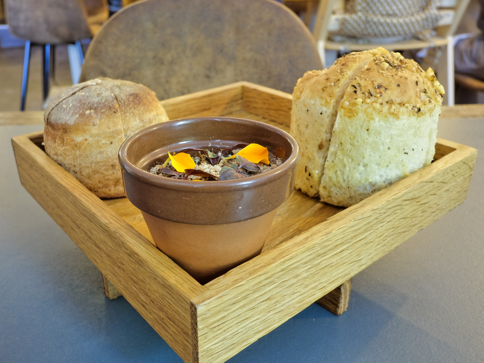 Vor dem Menü wurde etwas Brot, Focaccia und ein Frischkäse Dip mit Kürbis, Kürbiskernen und Sonnenblumenkernen gereicht, sehr lecker.