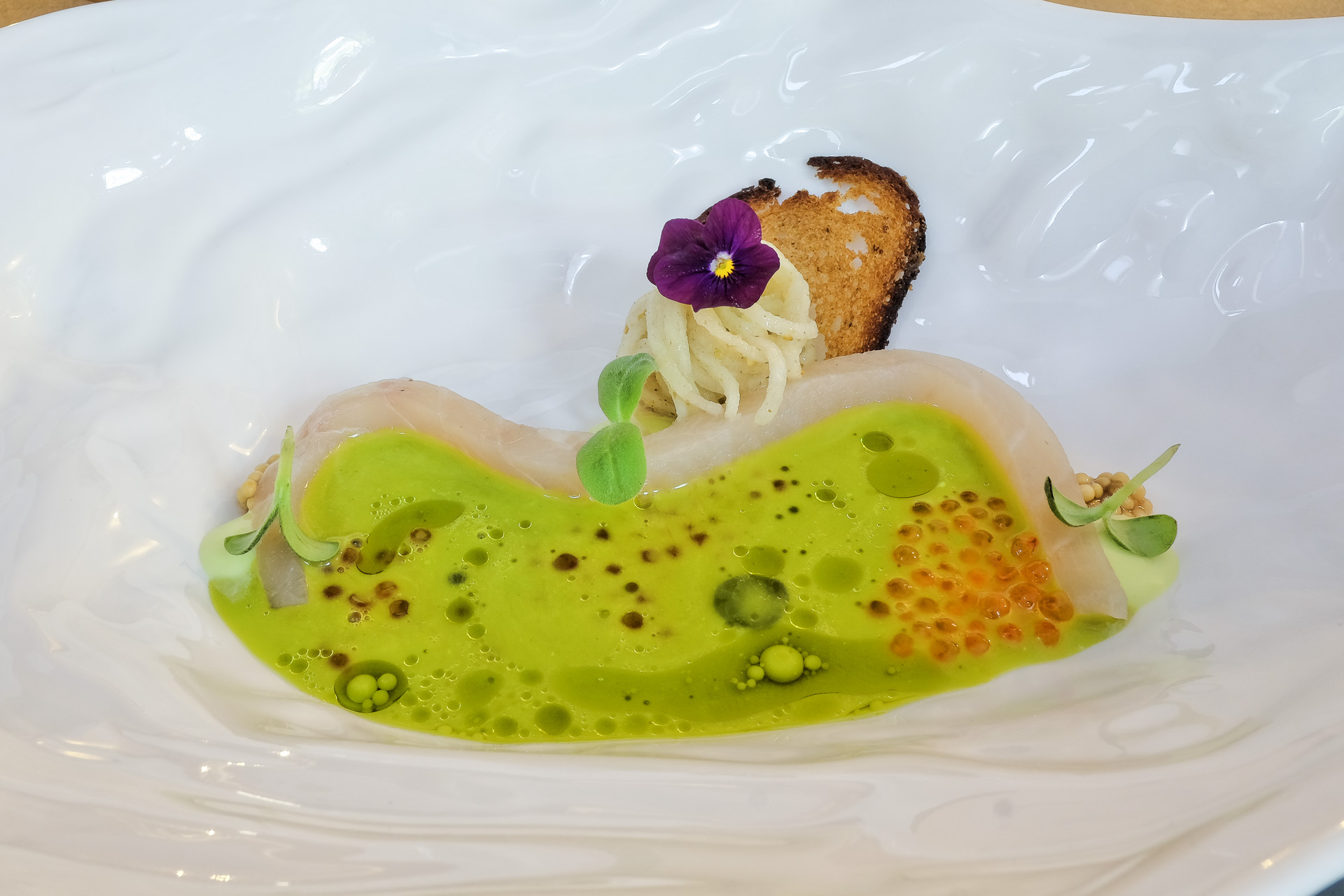 Der Hamachi Bauch hatte eine zarte wachsweiche Textur und ein feines Aroma. Dazu gab es Forellen Kaviar, etwas Senfsaat, einen knackigen Kohlrabi Salat, etwas Wasabi Mayonnaise und einen krossen Brotchip. Angegossen wurde ein Kopfsalat Süppchen mit Ayran. Ein schönes Gericht, sehr lecker.