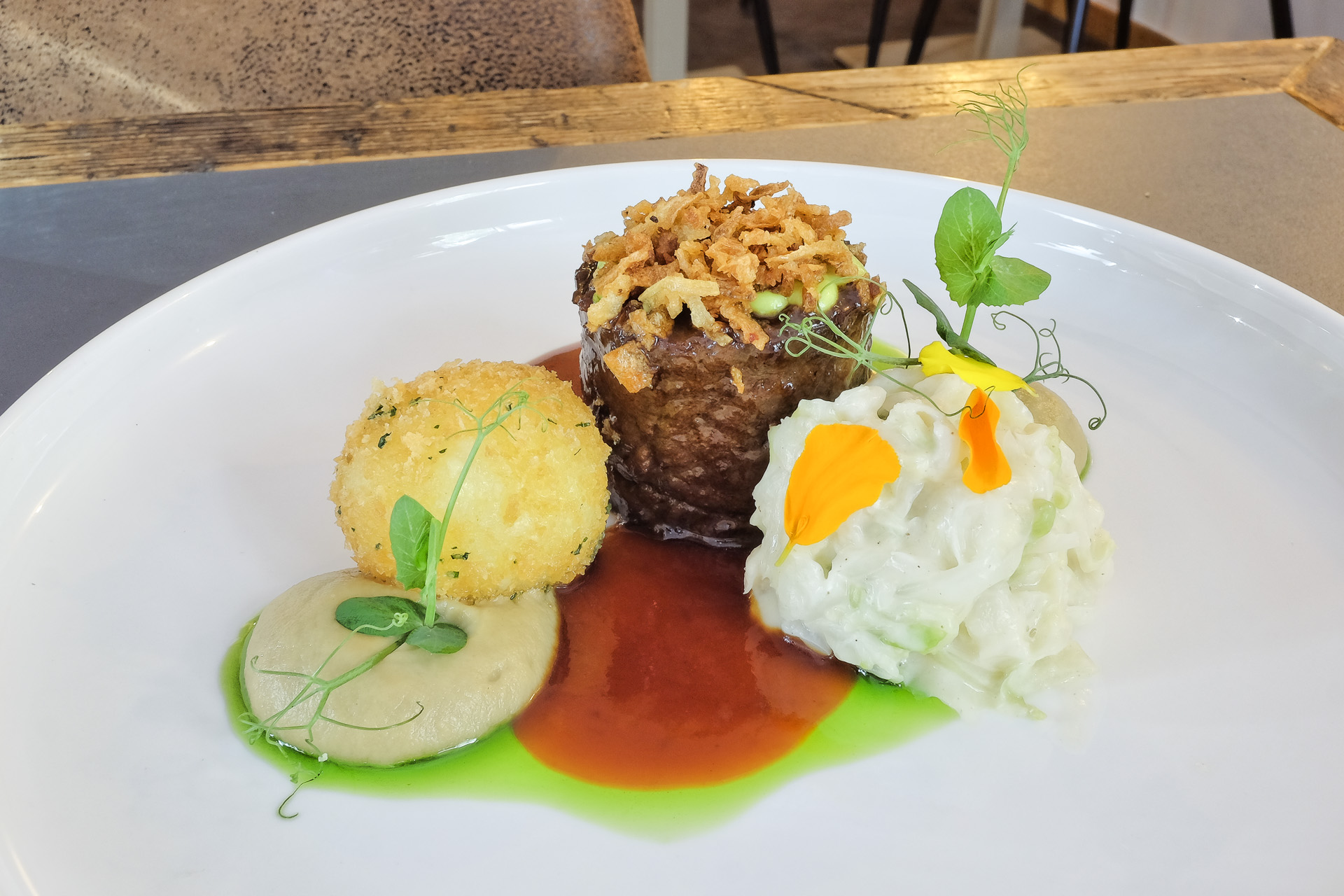 Die Roulade war zart und mürbe, gefüllt war sie mit einer Art Hack bzw. Farce. Sie hatte ein feines Aroma aber war auch etwas trocken, bedeckt war sie mit Petersilien Mayo und Röstzwiebeln. Dazu gab es Rahm Wirsing, eine Wirsingcreme, einen zarten aromatischen Kartoffelkloß und einen Schmorjus mit etwas Petersilien Öl. Sehr lecker.