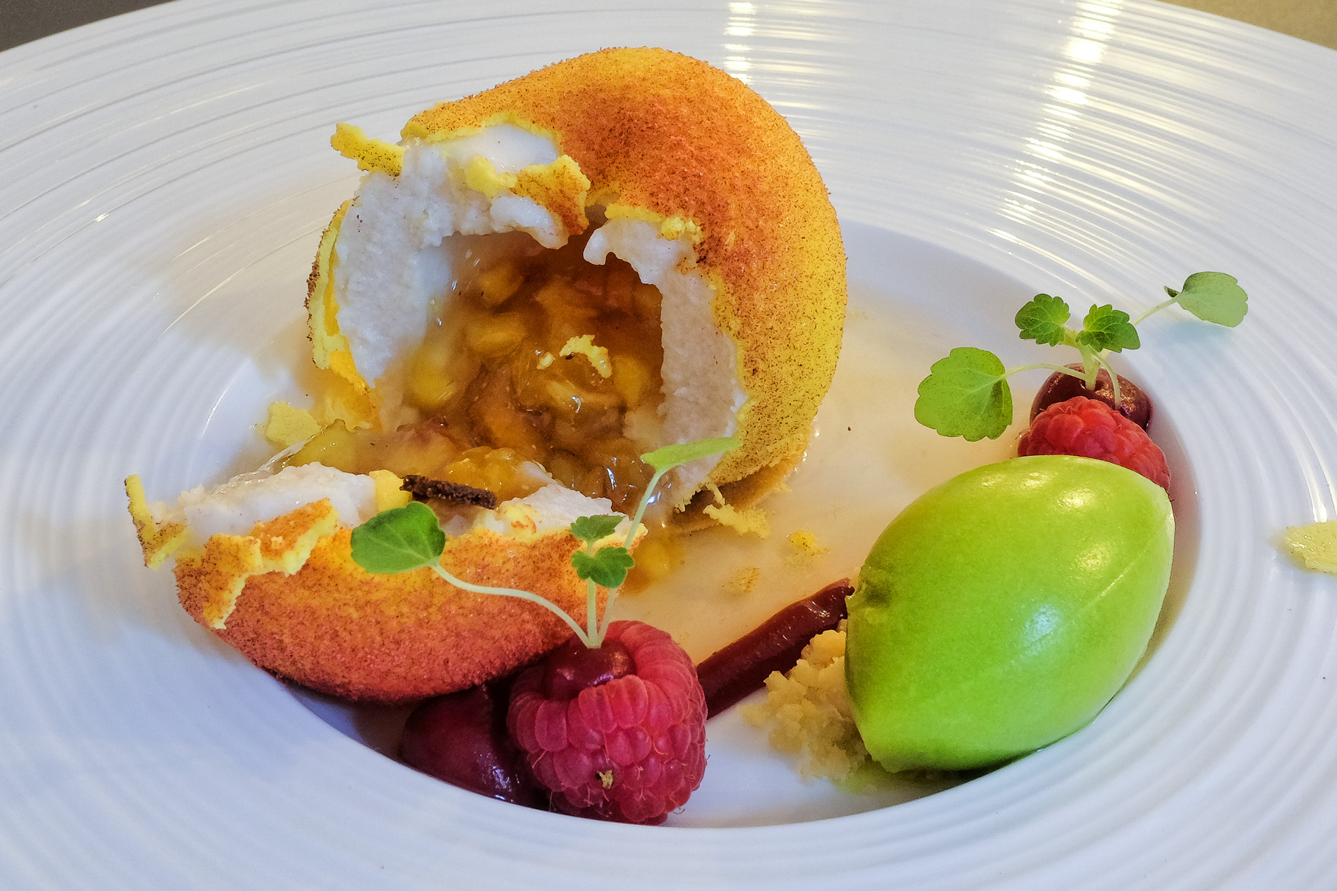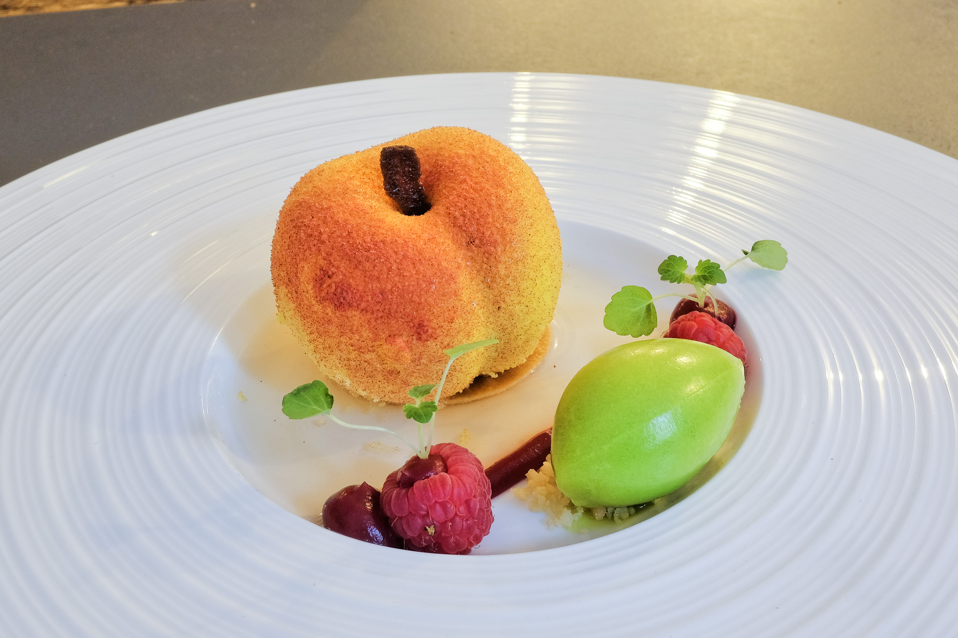 Der "Pfirsich" hatte eine Hülle aus weißer Schokolade, gefüllt war er mit einer zarten Pfirsich Joghurt Mousse und einem Pfirsich Kompott. Dazu gab es Himbeeren, Himbeer Gel, Butter Crumble, ein Rucola Sorbet und einen Champagner Sud der dem Dessert Frische und eine feine Alkoholnote gab. Ein schönes Dessert, sehr lecker.