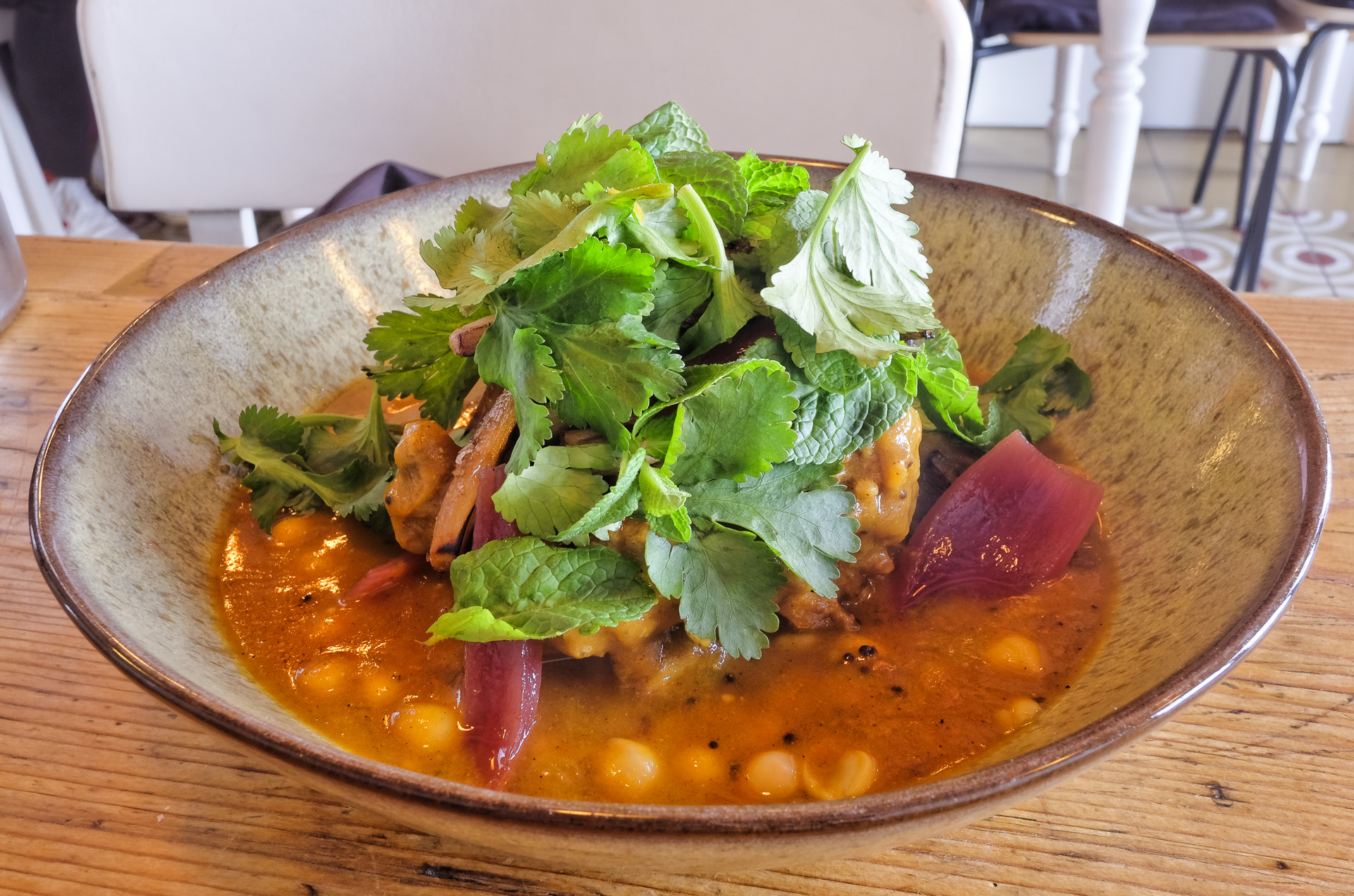 Die Hühnerkeule (von Odefey & Töchter) war zart und hatte ein feines Aroma. Das Curry war pikant und hatte ein komplexes Geschmacksbild. Dazu gab es Kichererbsen, gebratene Kräuterseitlinge, eingelegte Zwiebeln und verschiedene Kräuter. Sehr lecker.